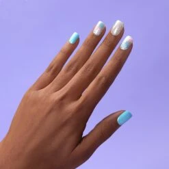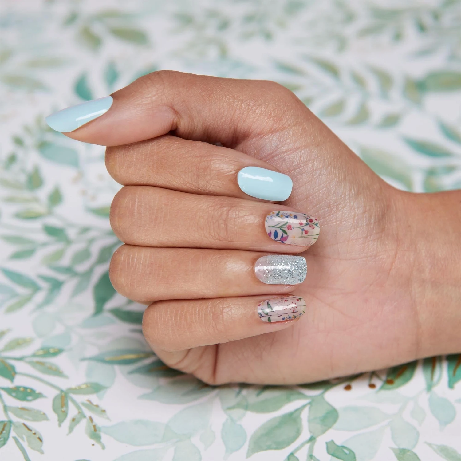 Ready to turn over A New Leaf? Try switching out your nails for this turquoise set with glitter and floral accents.