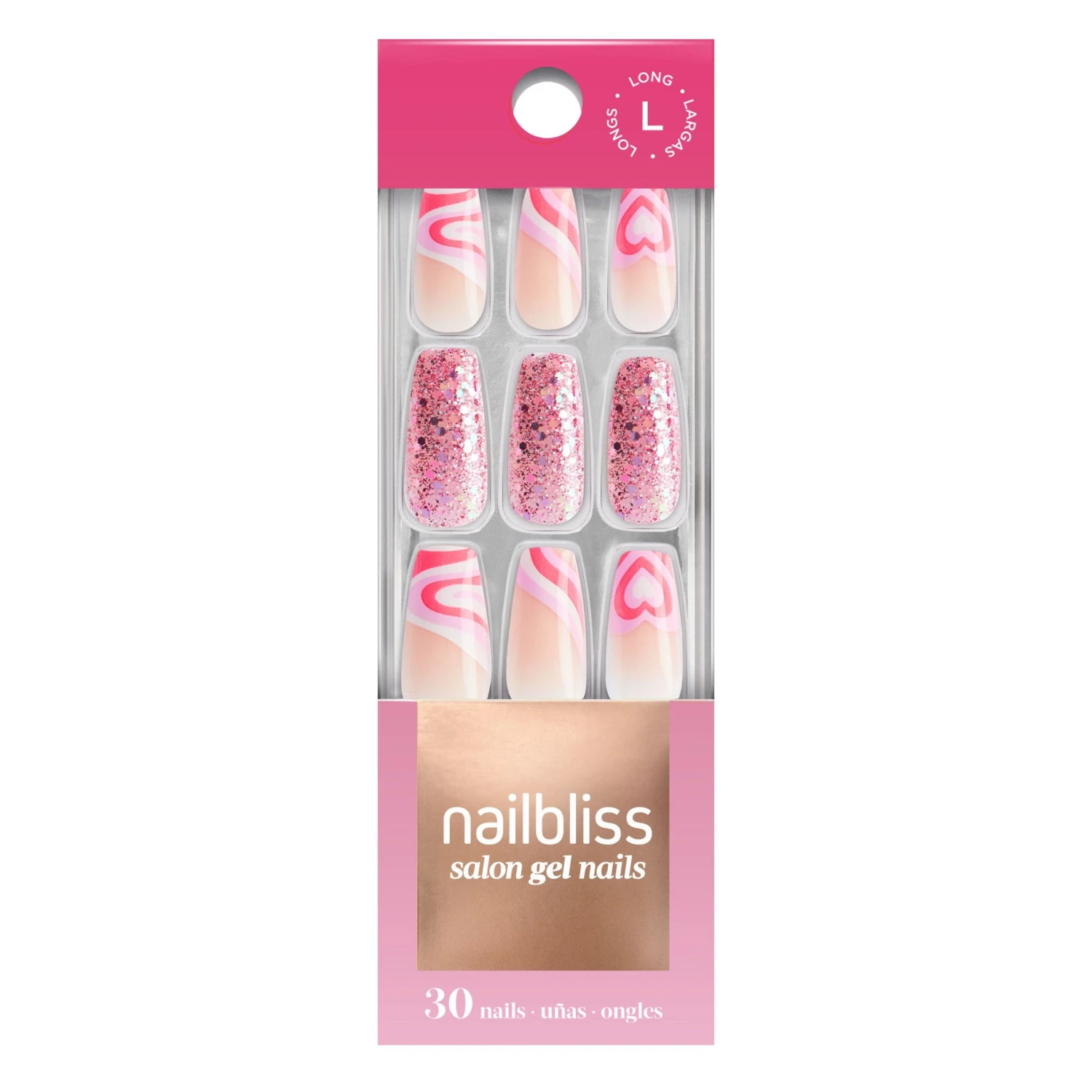 Long length, coffin shape, glossy finish nude glue-on nails featuring pink glitter, swirly heart designs, and a colorful French tip with salon strength & professional shine.