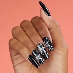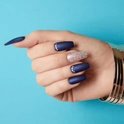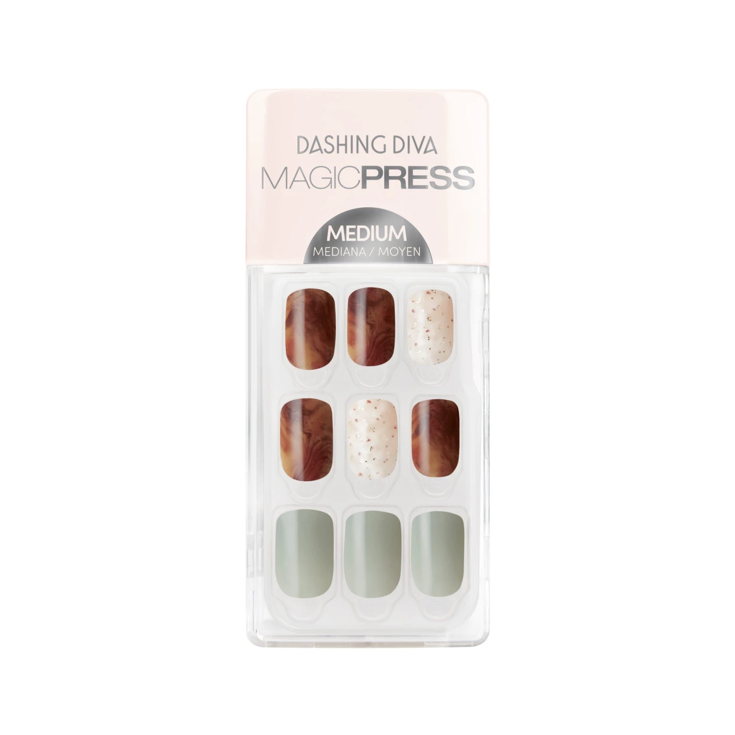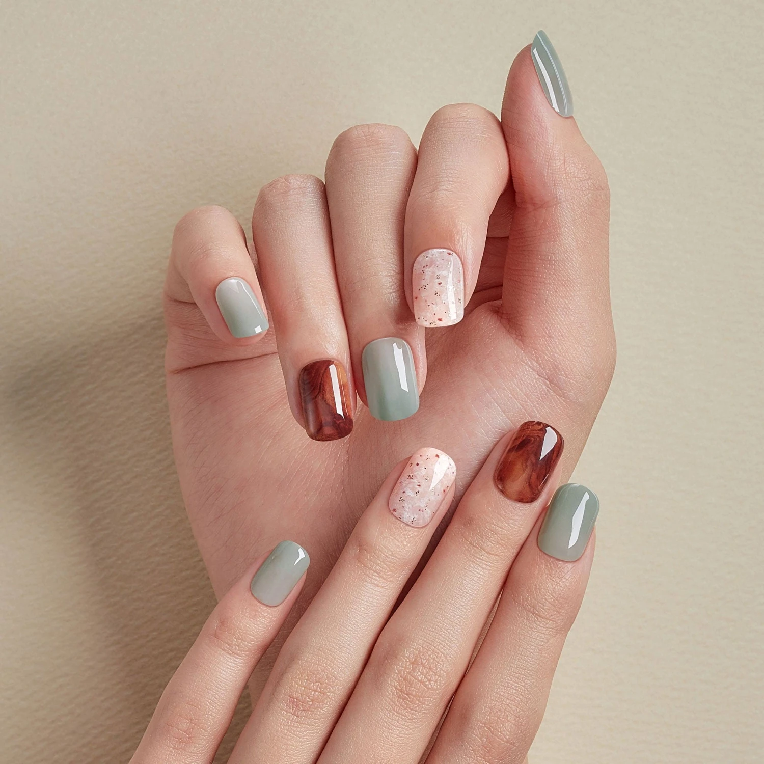 Amber Ale makes everything better! Medium length, square shape, glossy finish sage green press-on gel nails featuring golden speckled designs and an amber blend of browns.