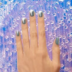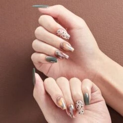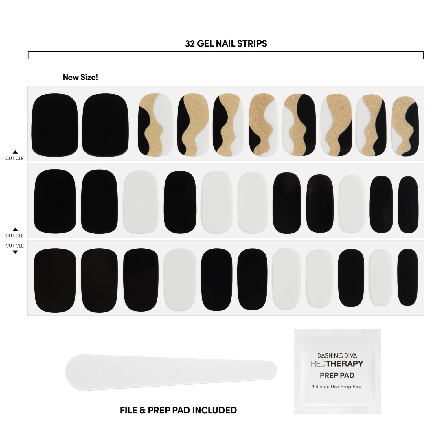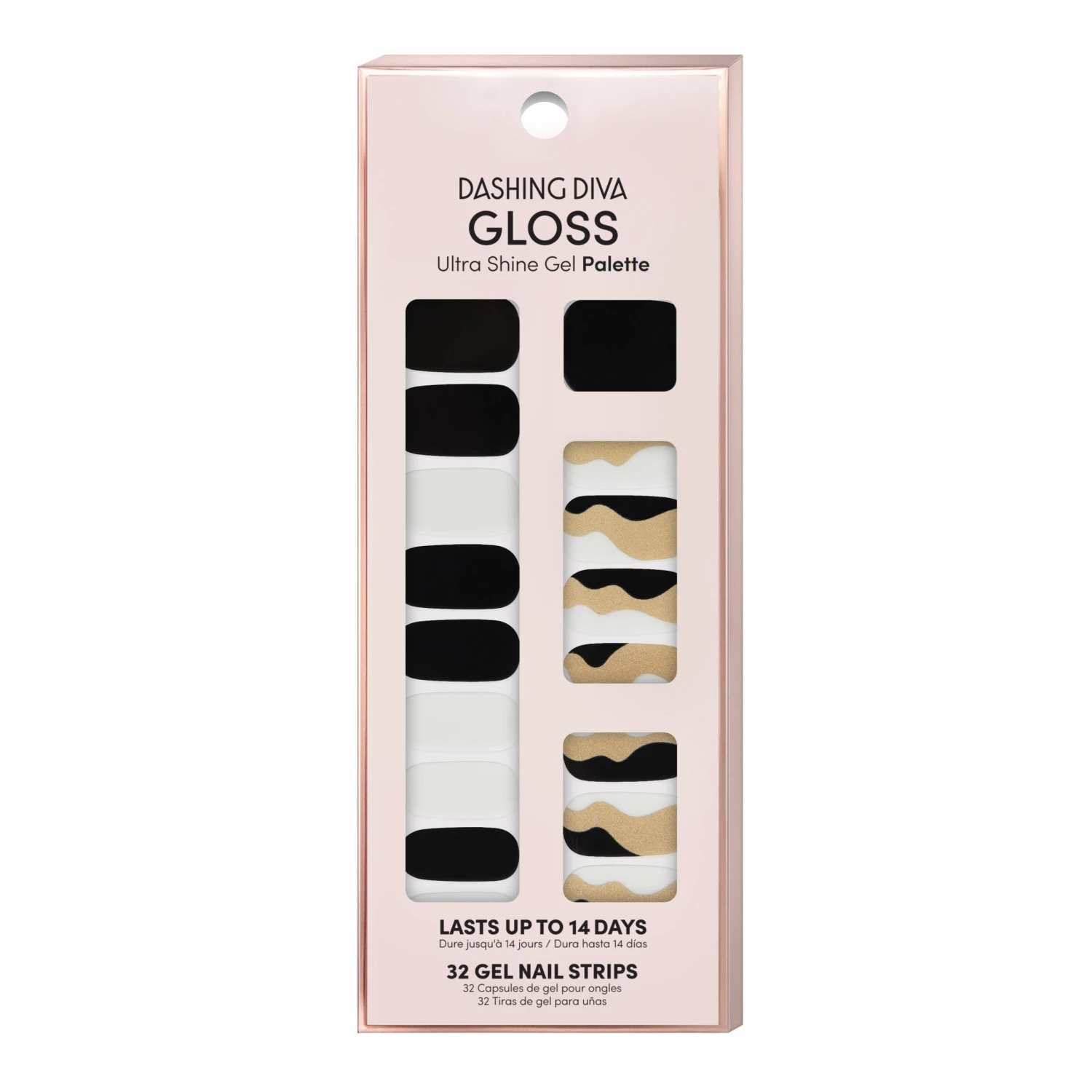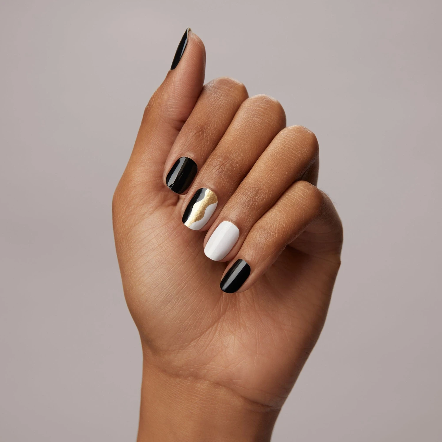 Black and white nail strips featuring gold pearl abstract waves with a glossy, high-shine finish.