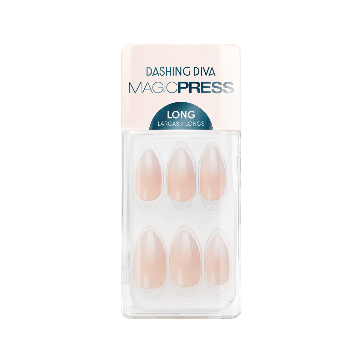 Even if you’re Barely Bougie, your nails look upper class. Long length, stiletto shape, glossy finish nude press-on gel nails featuring a soft ombré French tip.