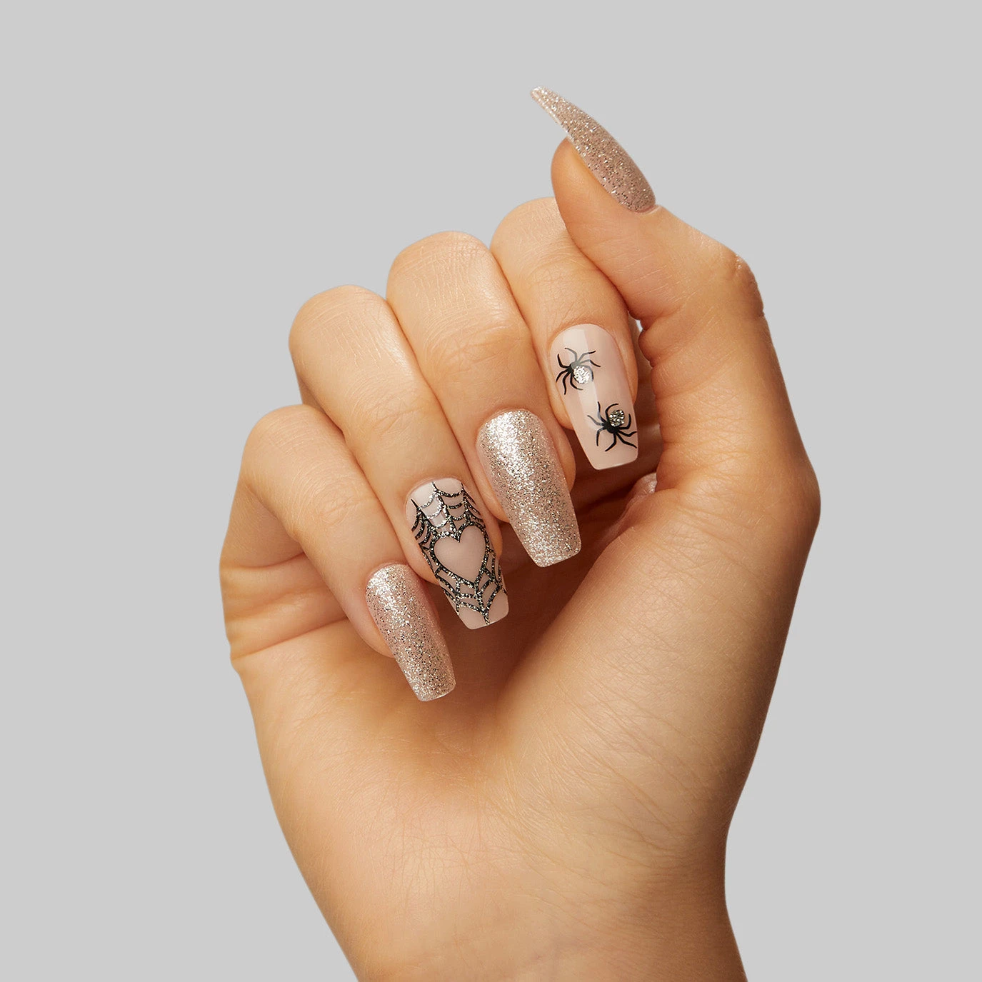 Long length, coffin shape, glossy finish. Nude pink glue-on gel nails featuring spiderwebs, spider icons, and silver glitter.
