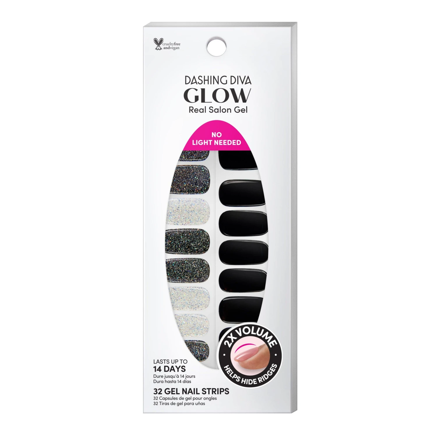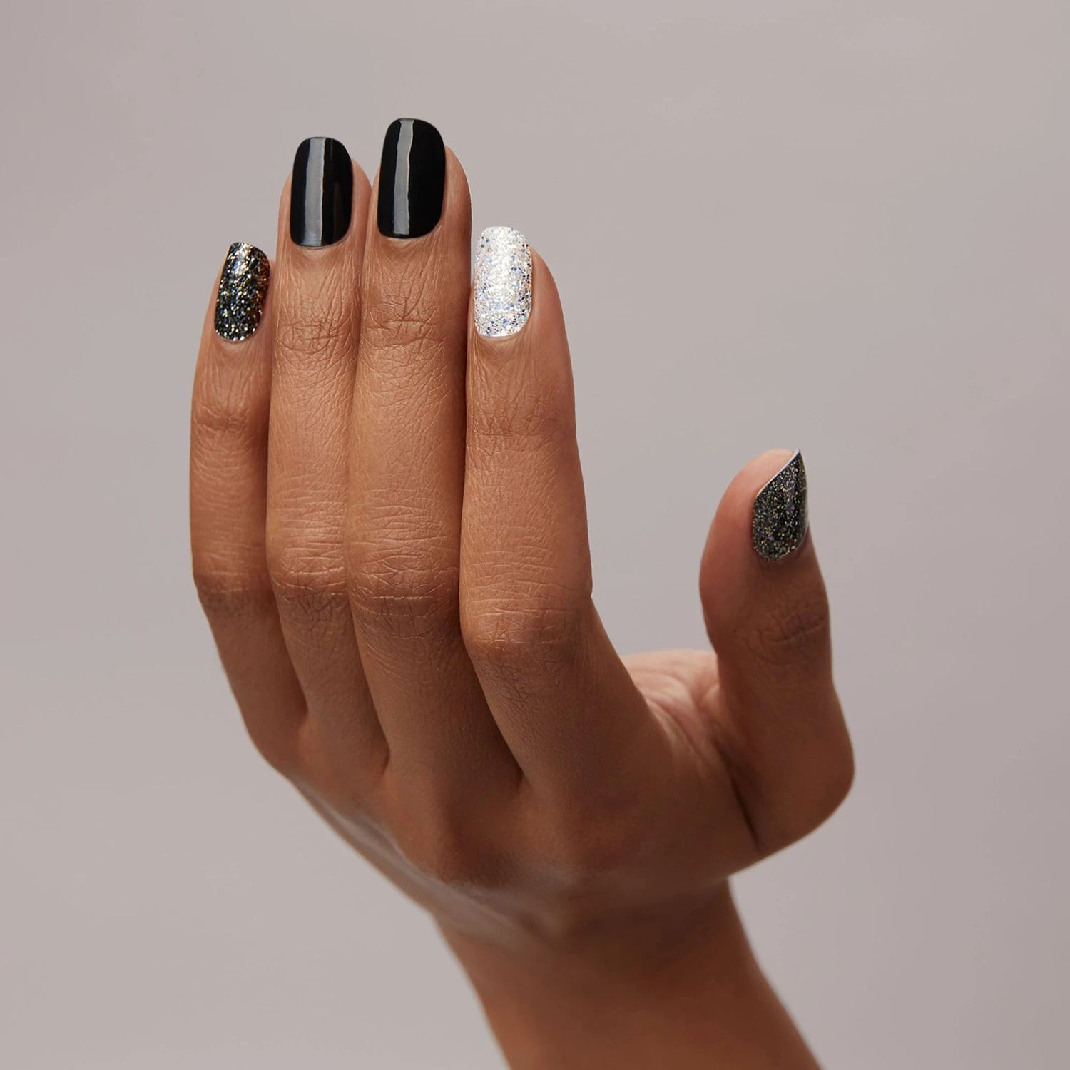 Glittered black gel nail strips featuring silver glitter with a double gel formula for an ultra smooth finish.