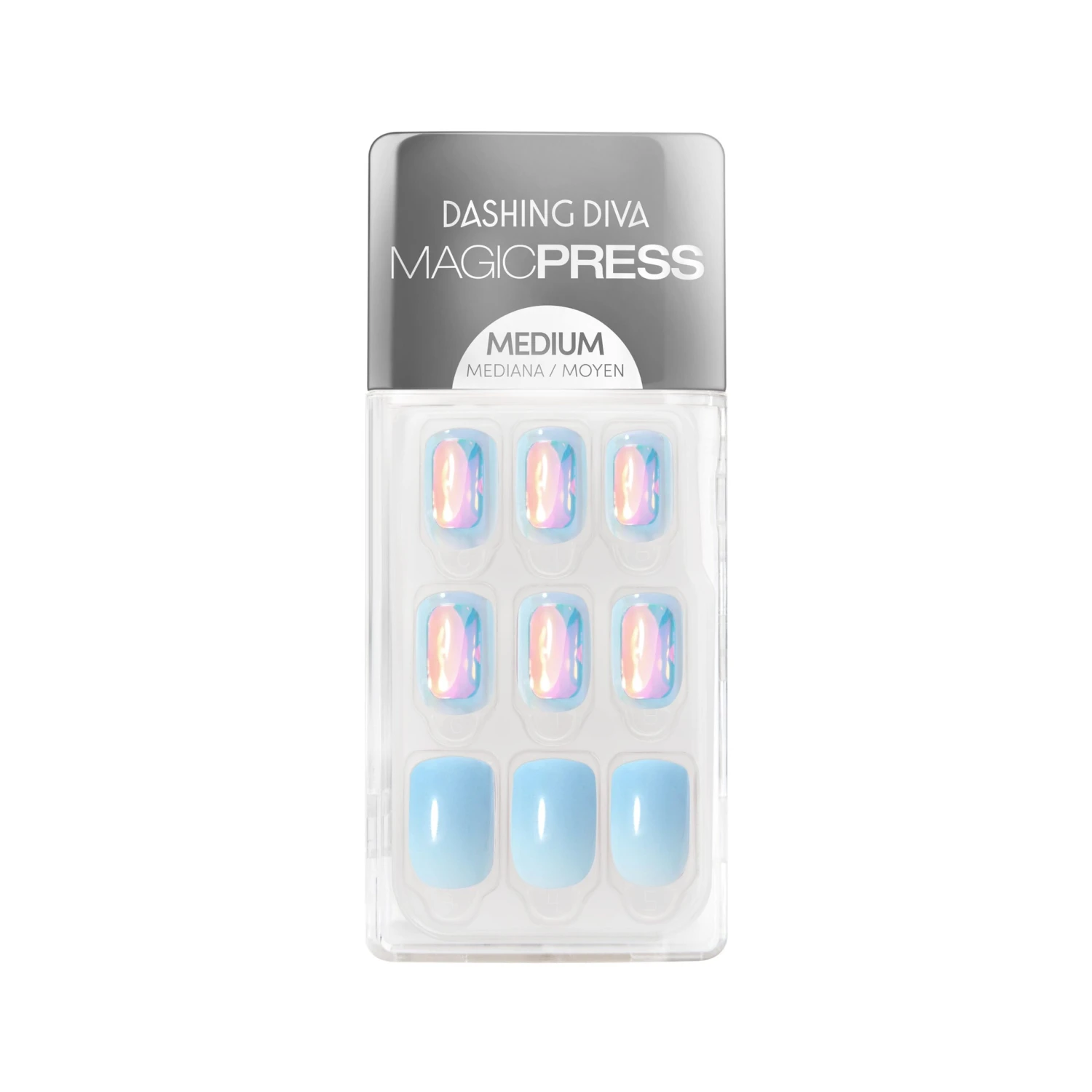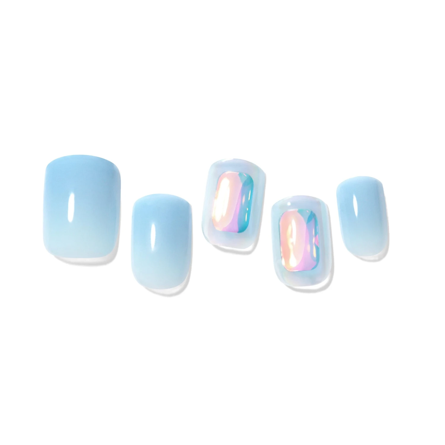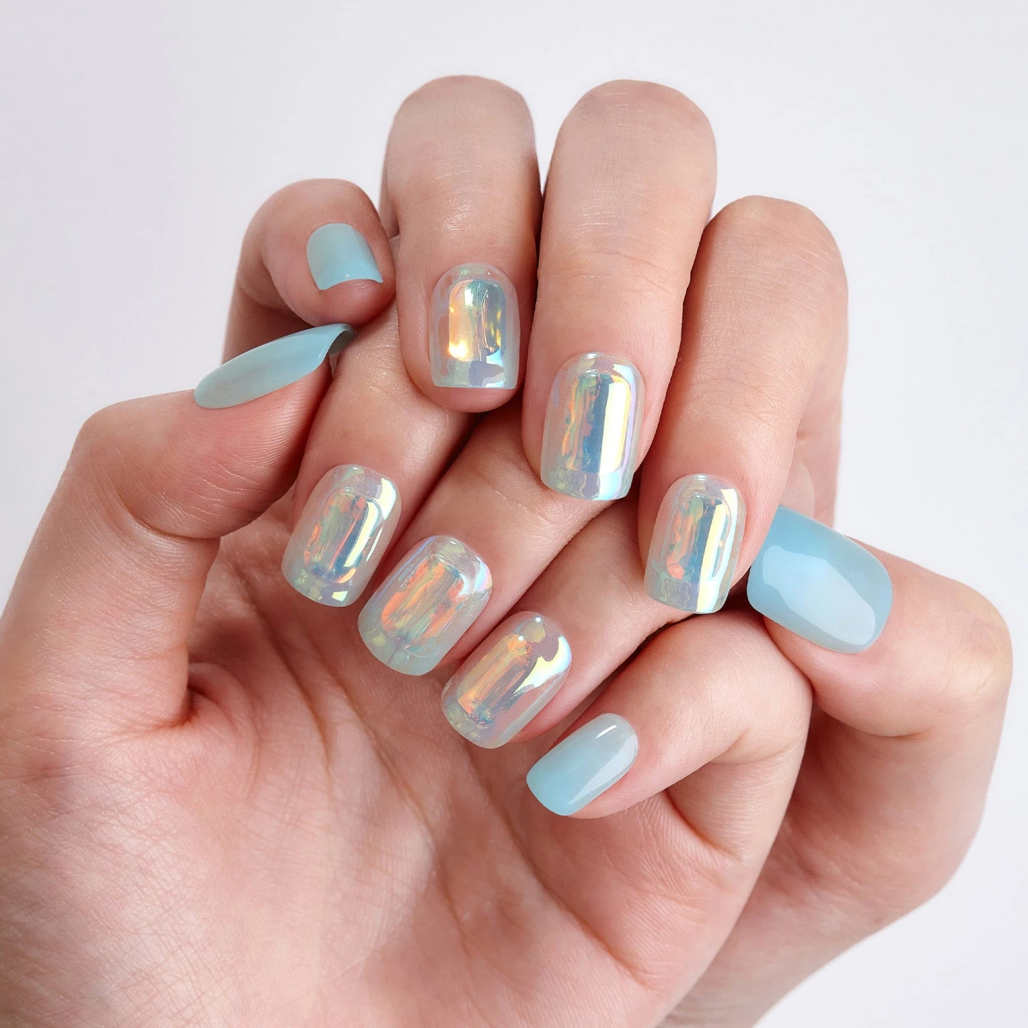 Medium length, square shape, glossy finish press-on gel nails. A Korean-beauty inspired manicure with the ‘glass nails’ trend accent.
