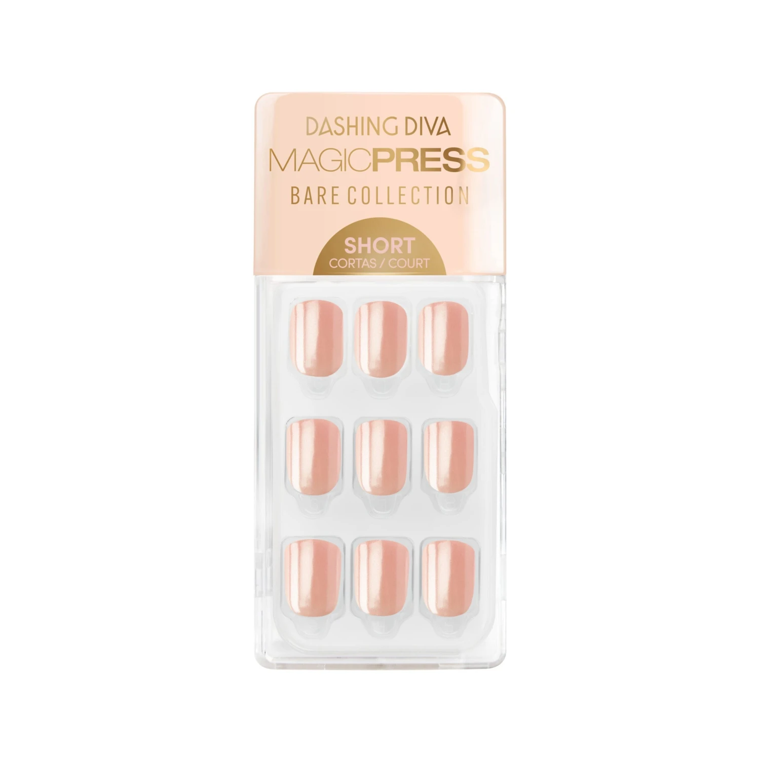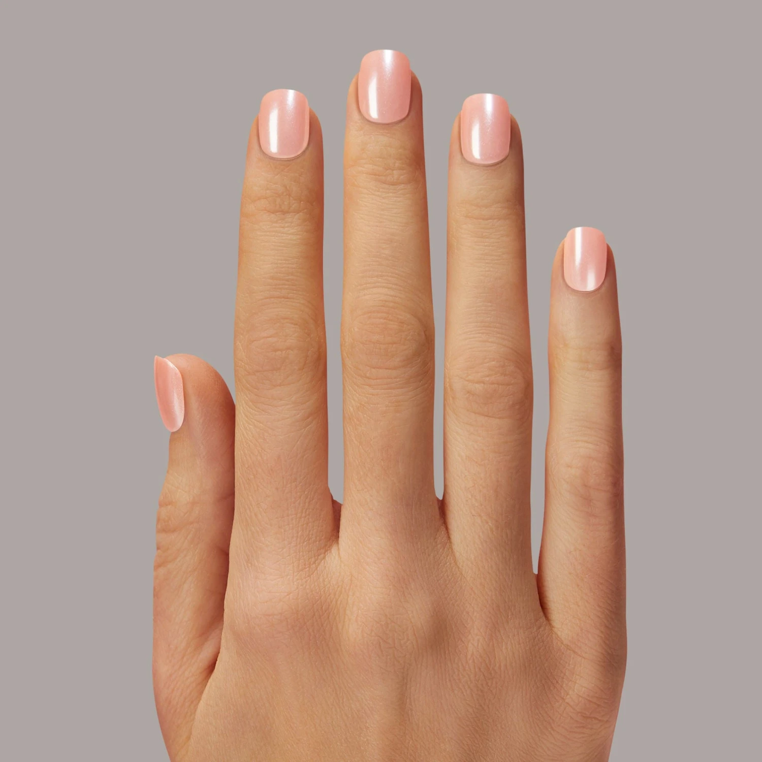 Short length, square shape, light pink press-on gel nails featuring a glossy, shimmery chrome finish.