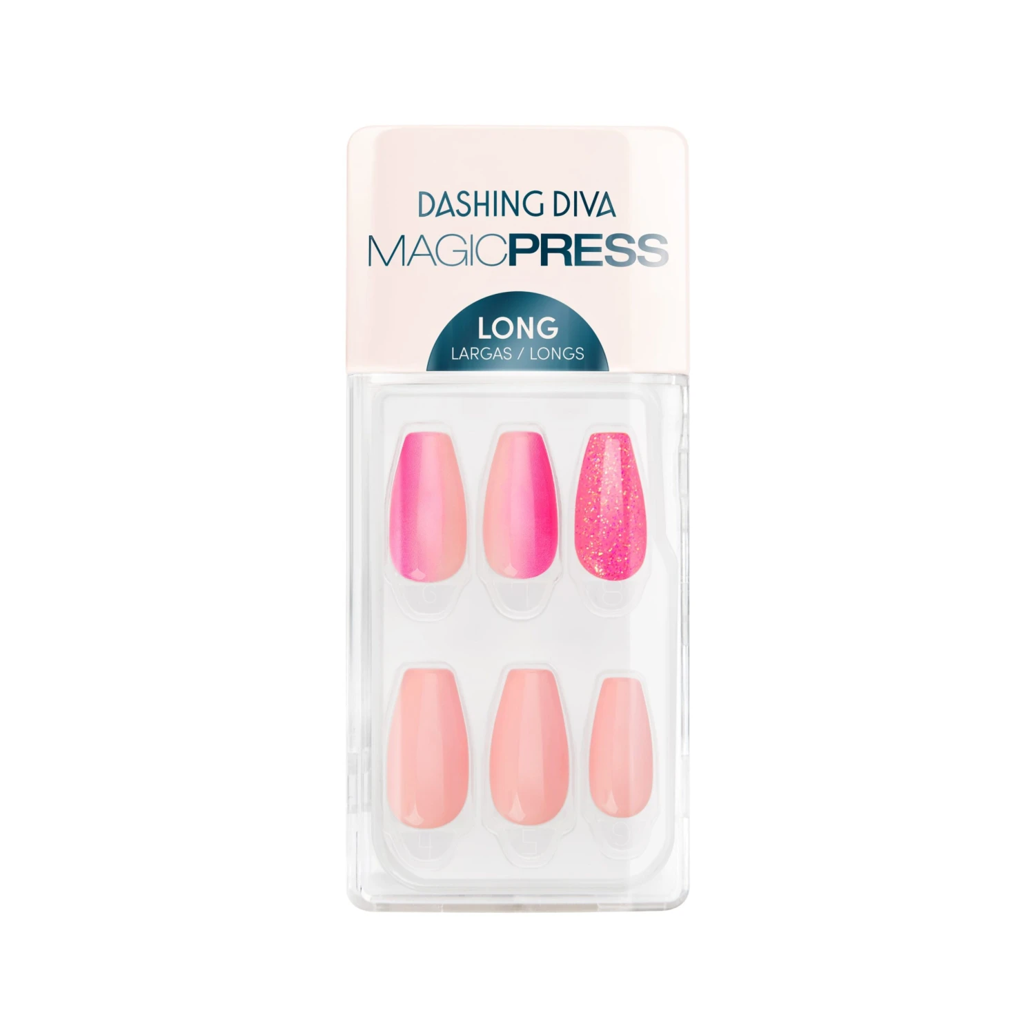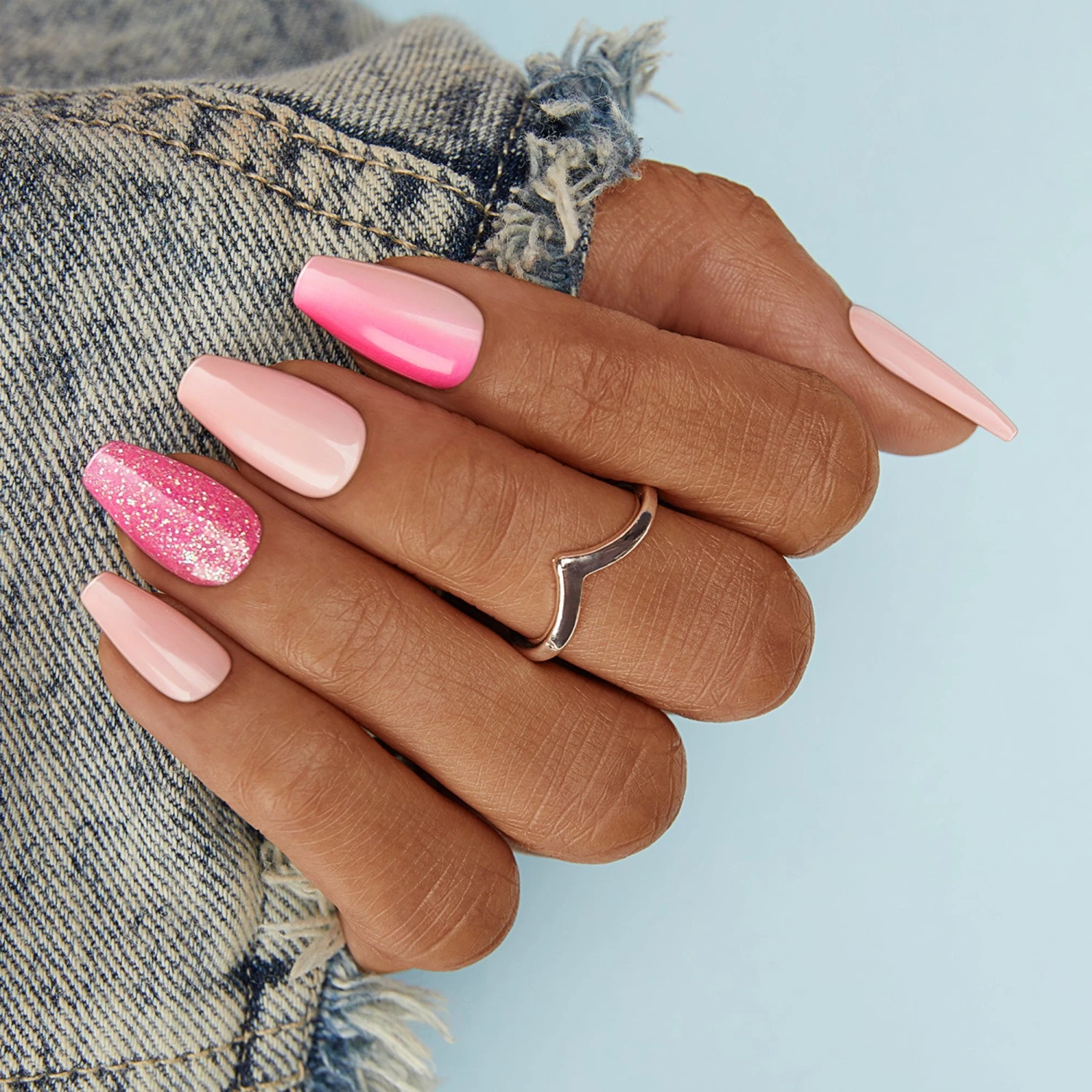 It’s Blush Hour – Time to flaunt some glamorous pink nails! Long length, coffin shape, glossy finish hot pink & light pink press-on gel nails featuring iridescent glitter & ombré accents.