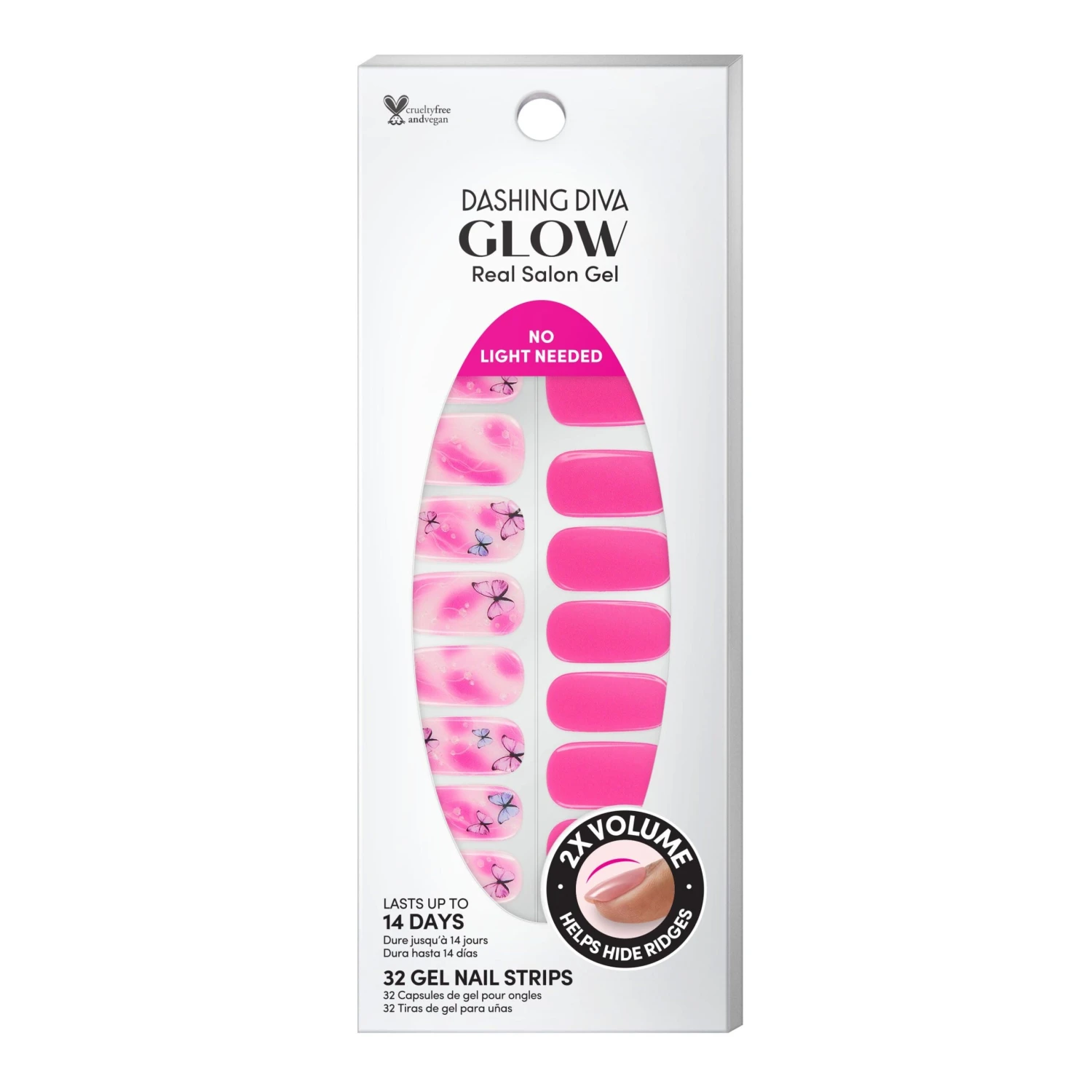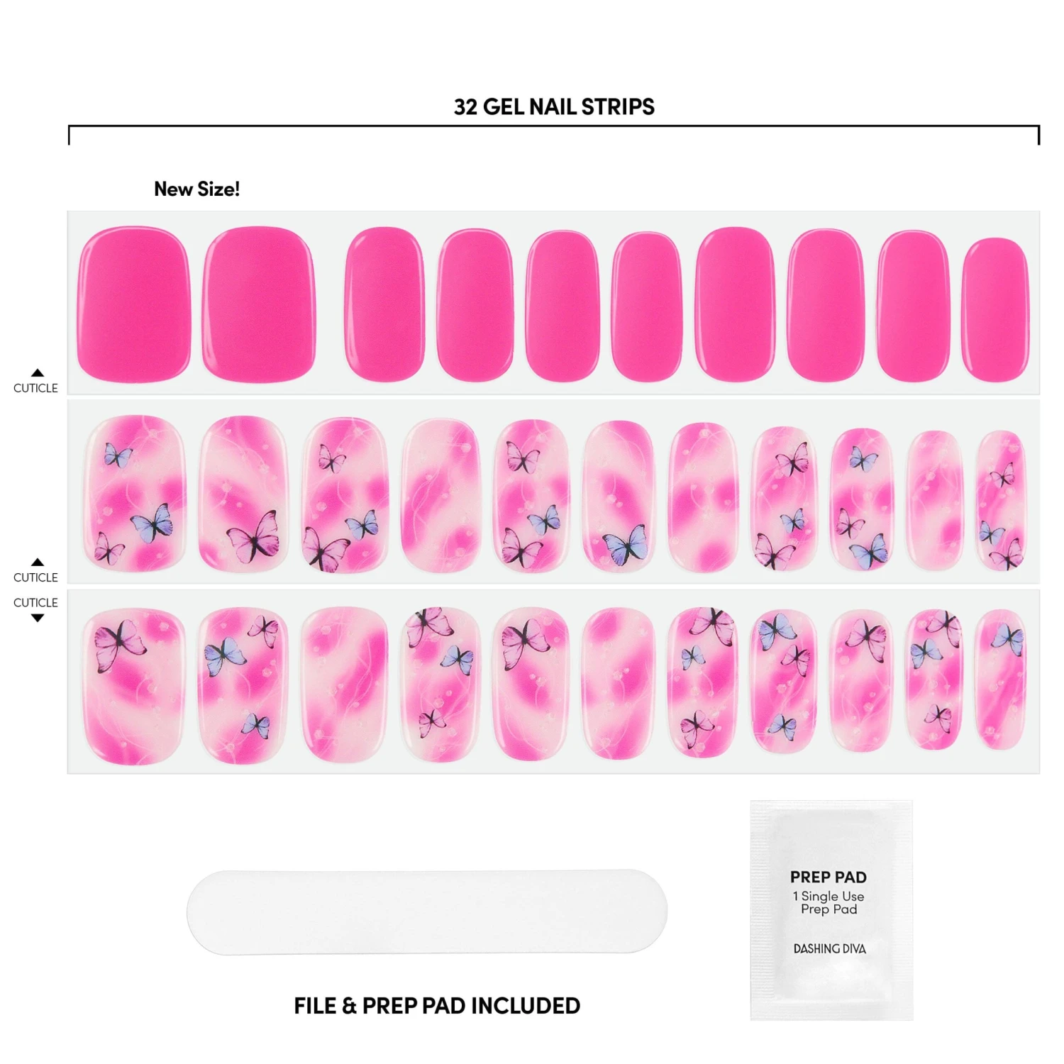 Hot pink & light pink gel nail strips featuring iridescent confetti glitter and butterfly accents with a double gel formula for an ultra-smooth finish.