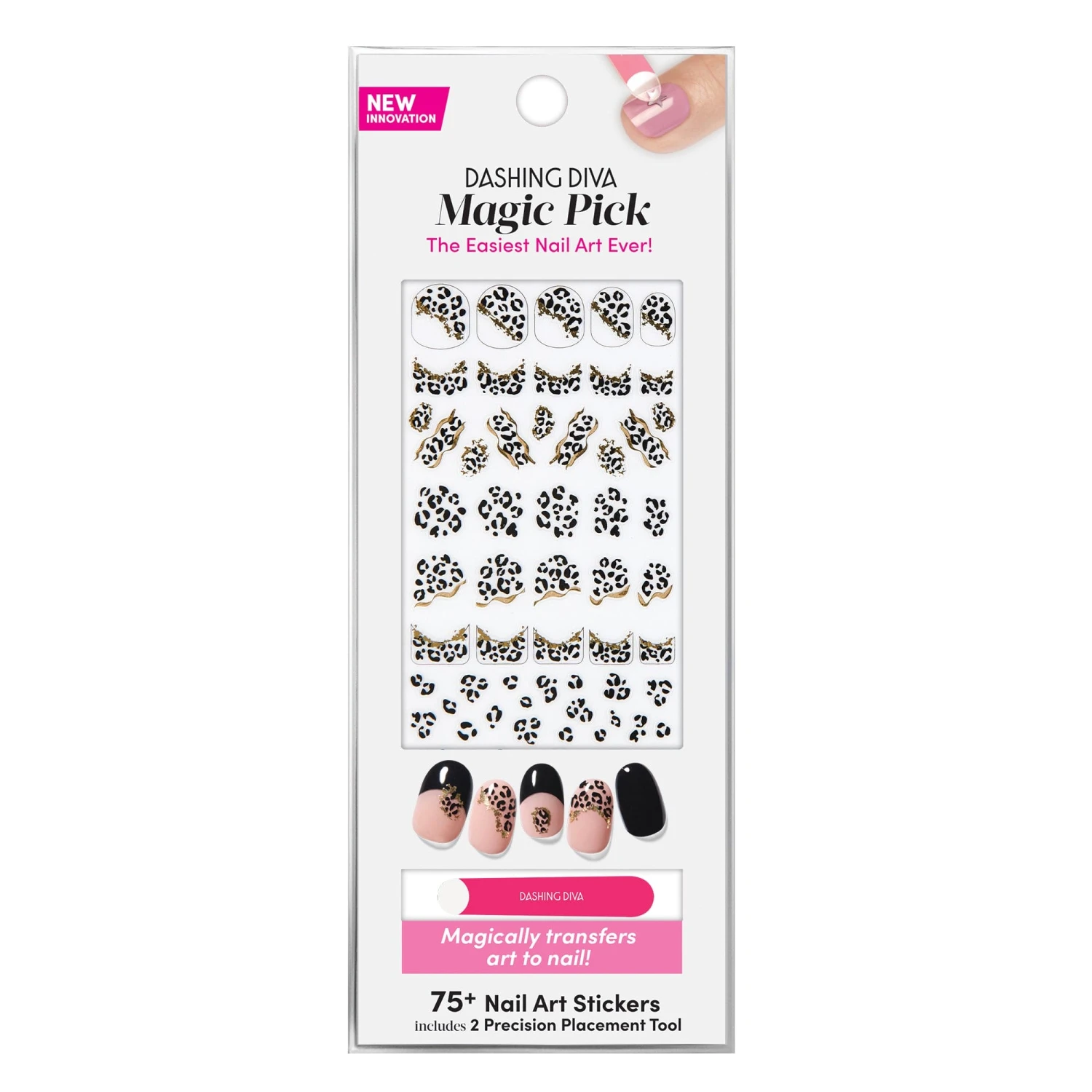 Stop catching butterflies, start chasing cheetahs. Premium nail art stickers featuring expressive designs, including gold foil & black leopard print in the style of French tips, asymmetrical French tips, and traditional design accents.