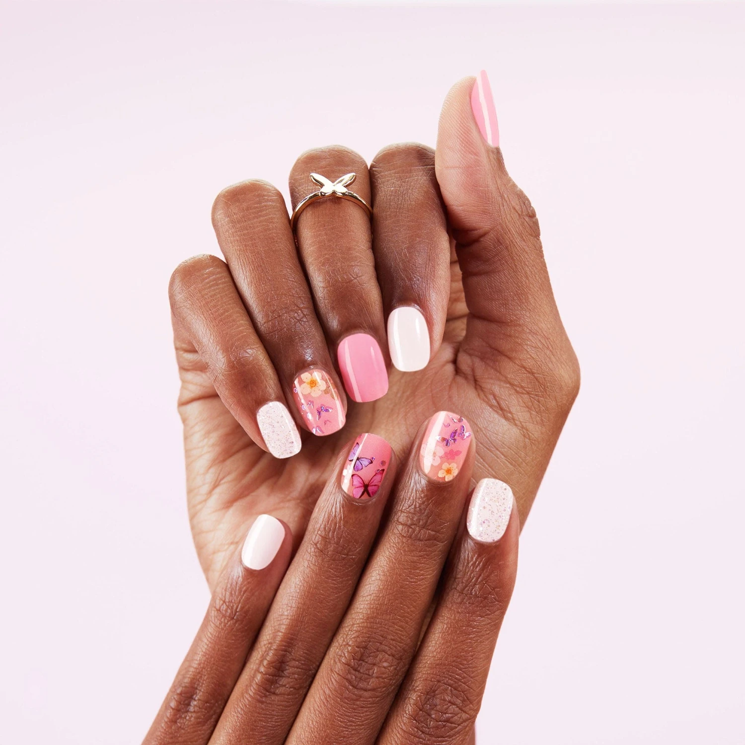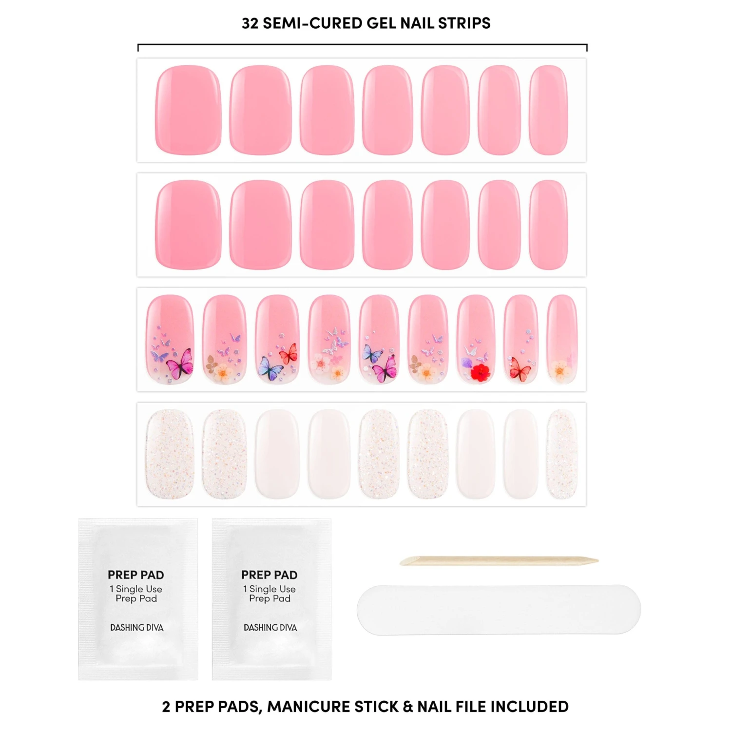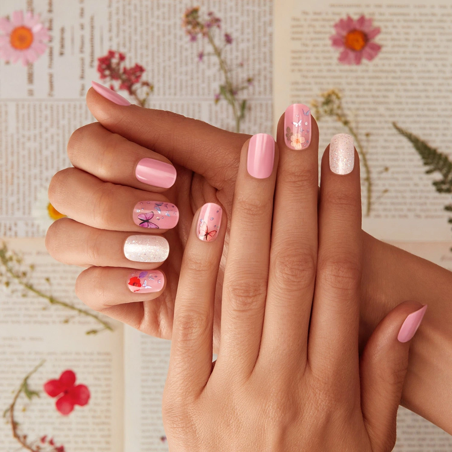 Semi-cured pink and sheer nude gel nail strips featuring iridescent glitter, holographic foil, and ombré accents with mega volume & maximum shine.