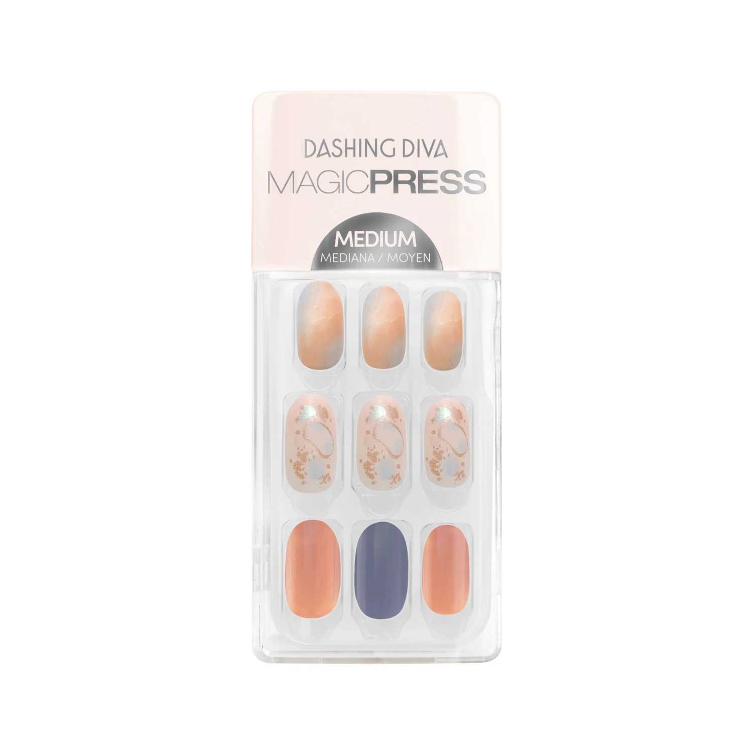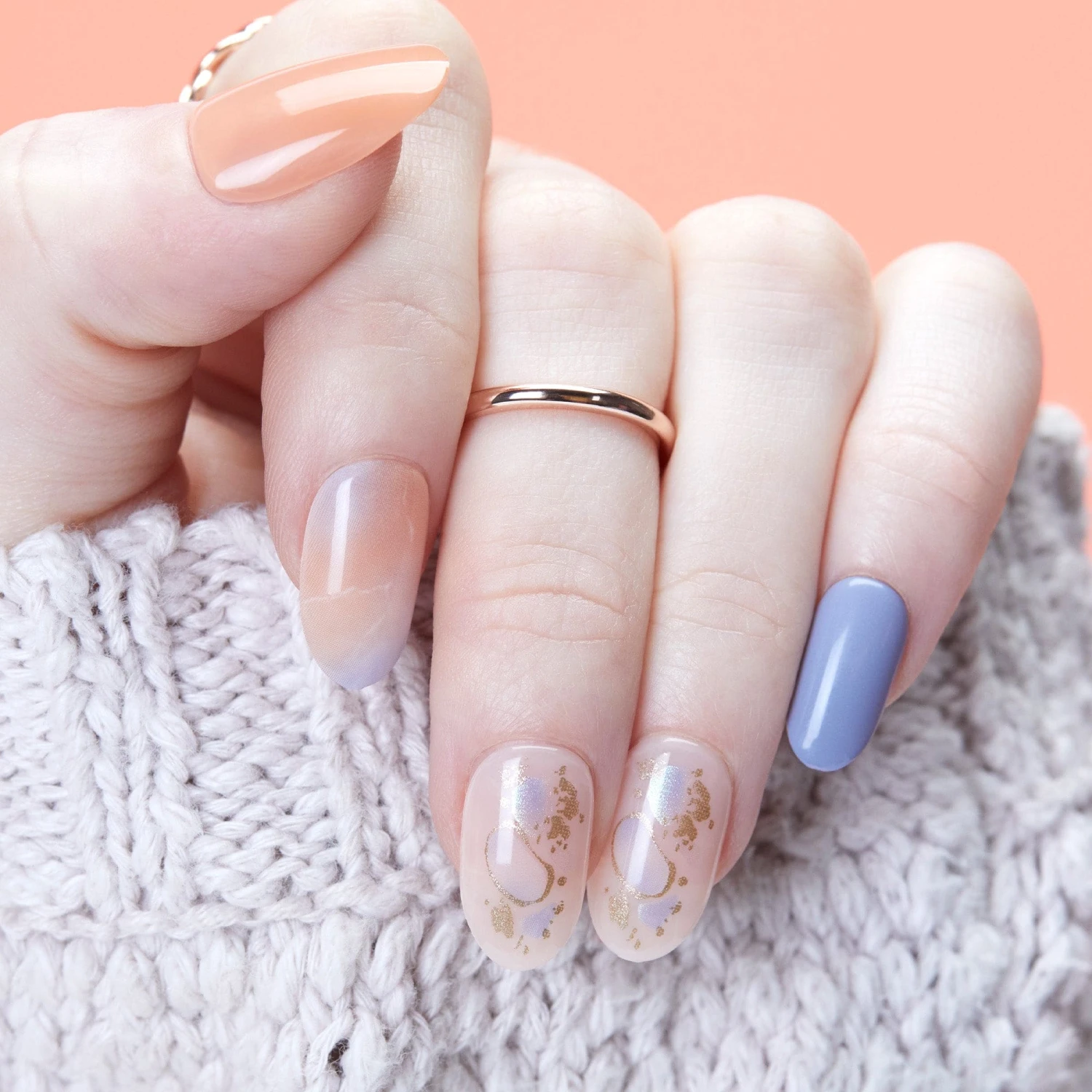 Your greatest adventure into nail art awaits! Medium length, oval shape, glossy finish peach & blue press-on gel nails featuring gold foil, iridescent details, and ombré accents.