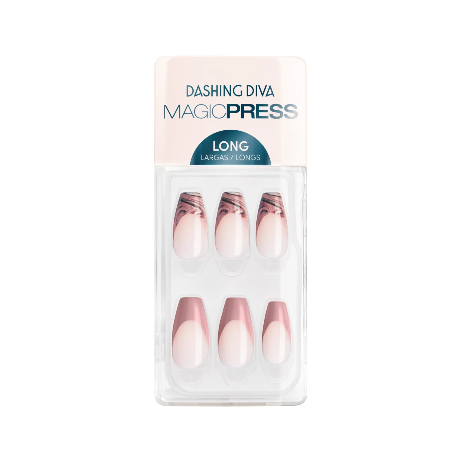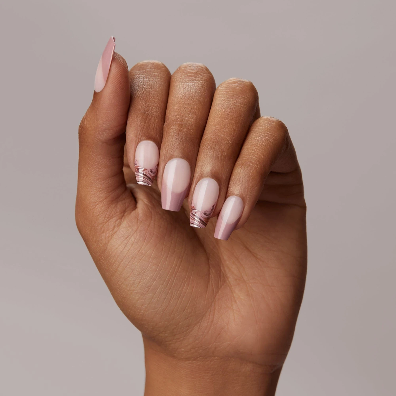 Long length, coffin shape, glossy finish. Semi-sheer nude press-on gel nails featuring tan french tips & swirled marble accents.