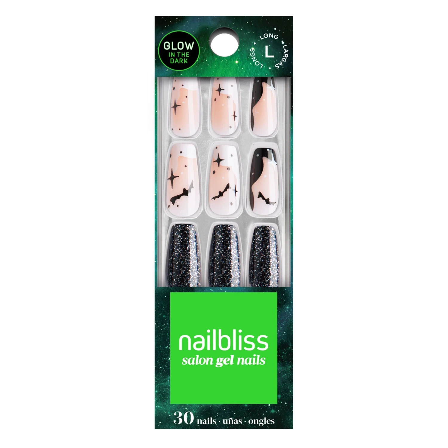 You’ve got the power to charm not one, but all creatures of the night. Long length, coffin shape, glossy finish glue-on gel nails featuring scalloped white and black French tips, silver glitter, and bat icons. Glow in the dark details.
