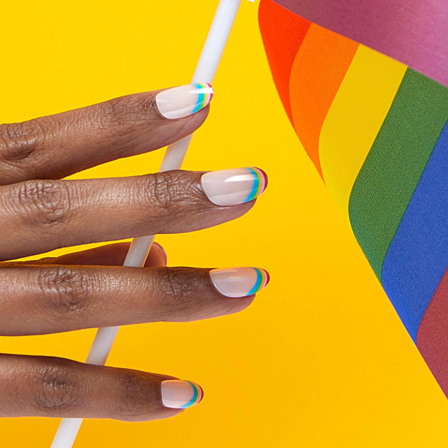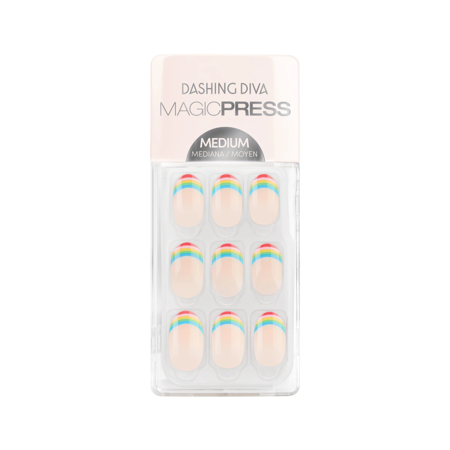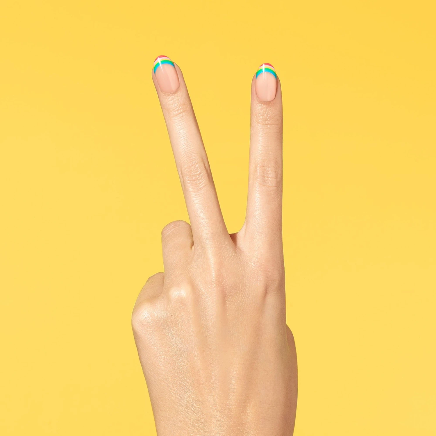 Chase your rainbows and you’ll change the world! Medium length, oval shape, glossy finish light nude press-on nails featuring rainbow striped French tips.