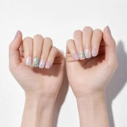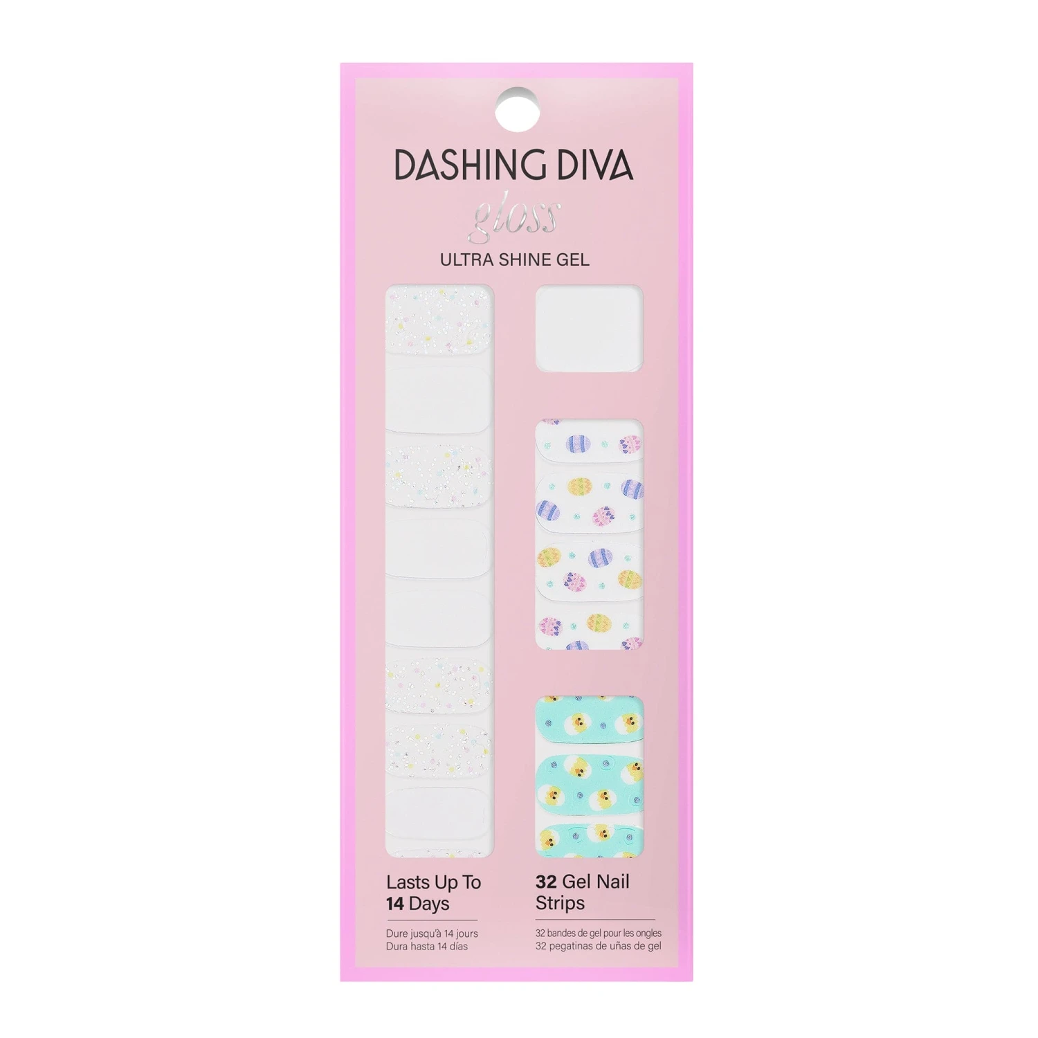 Seasonally chic! White and soft green gel nail strips featuring Easter eggs, baby chicks, and polka dots with a glossy, high-shine finish.