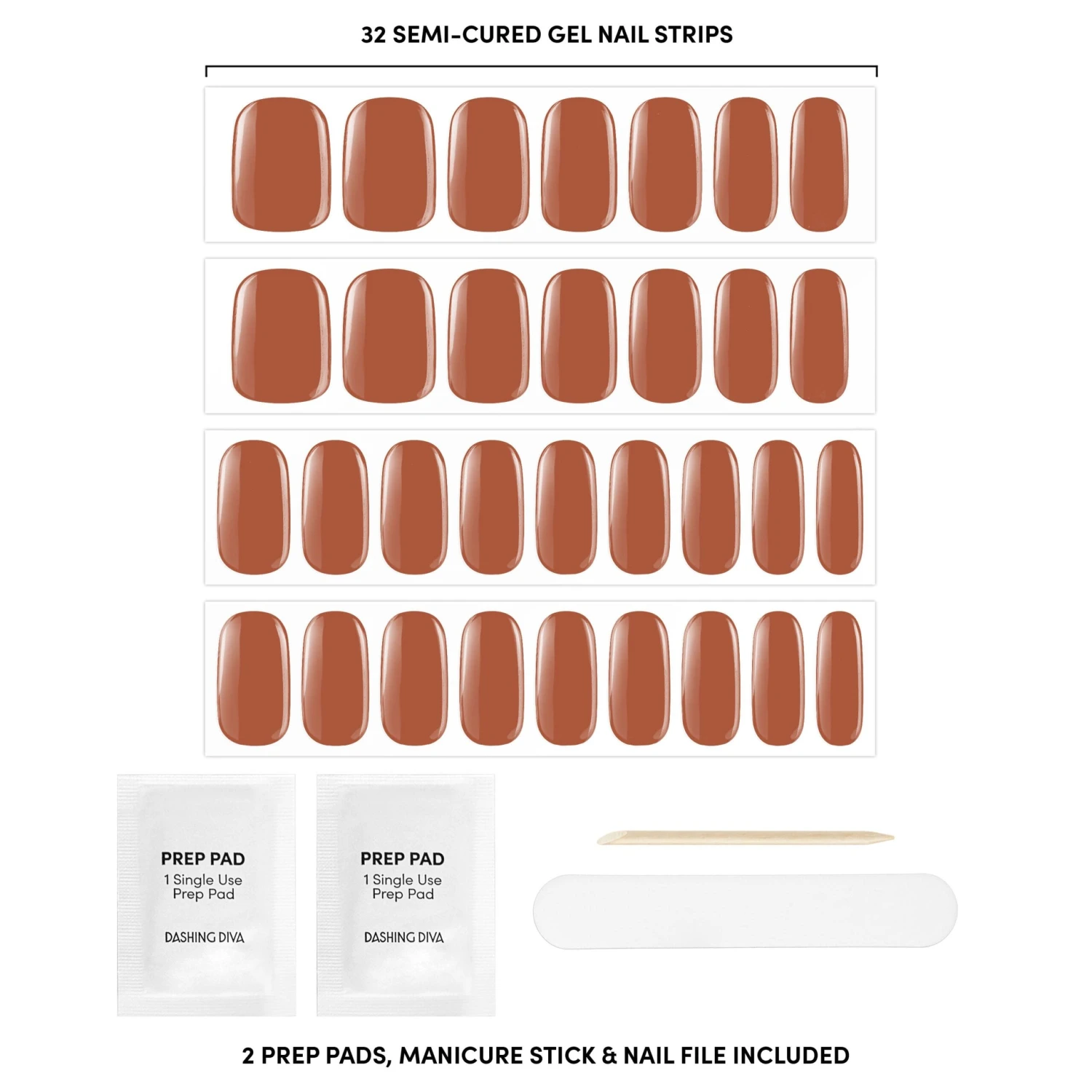 Semi-cured warm cinnamon brown gel nail strips with mega volume & an opaque finish.