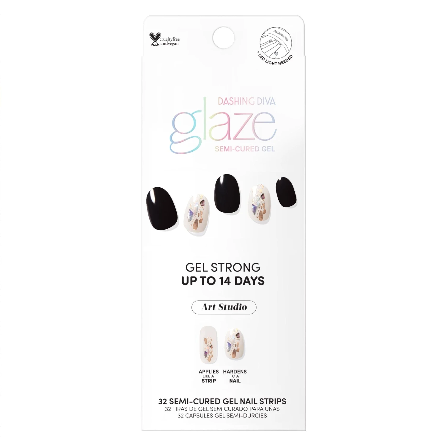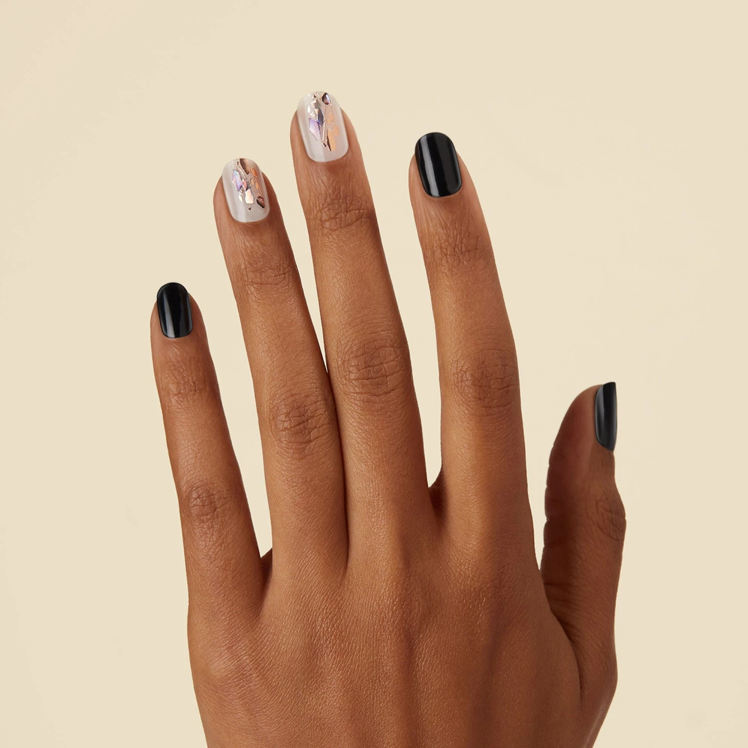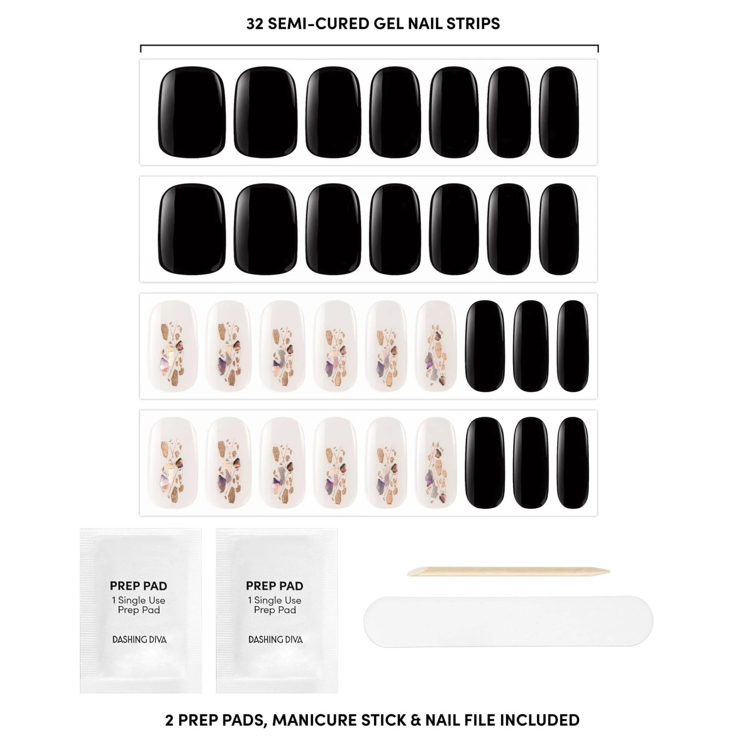 Semi-cured black & milky white gel nail strips featuring rose gold foil and mosaic accents with mega volume & maximum shine.