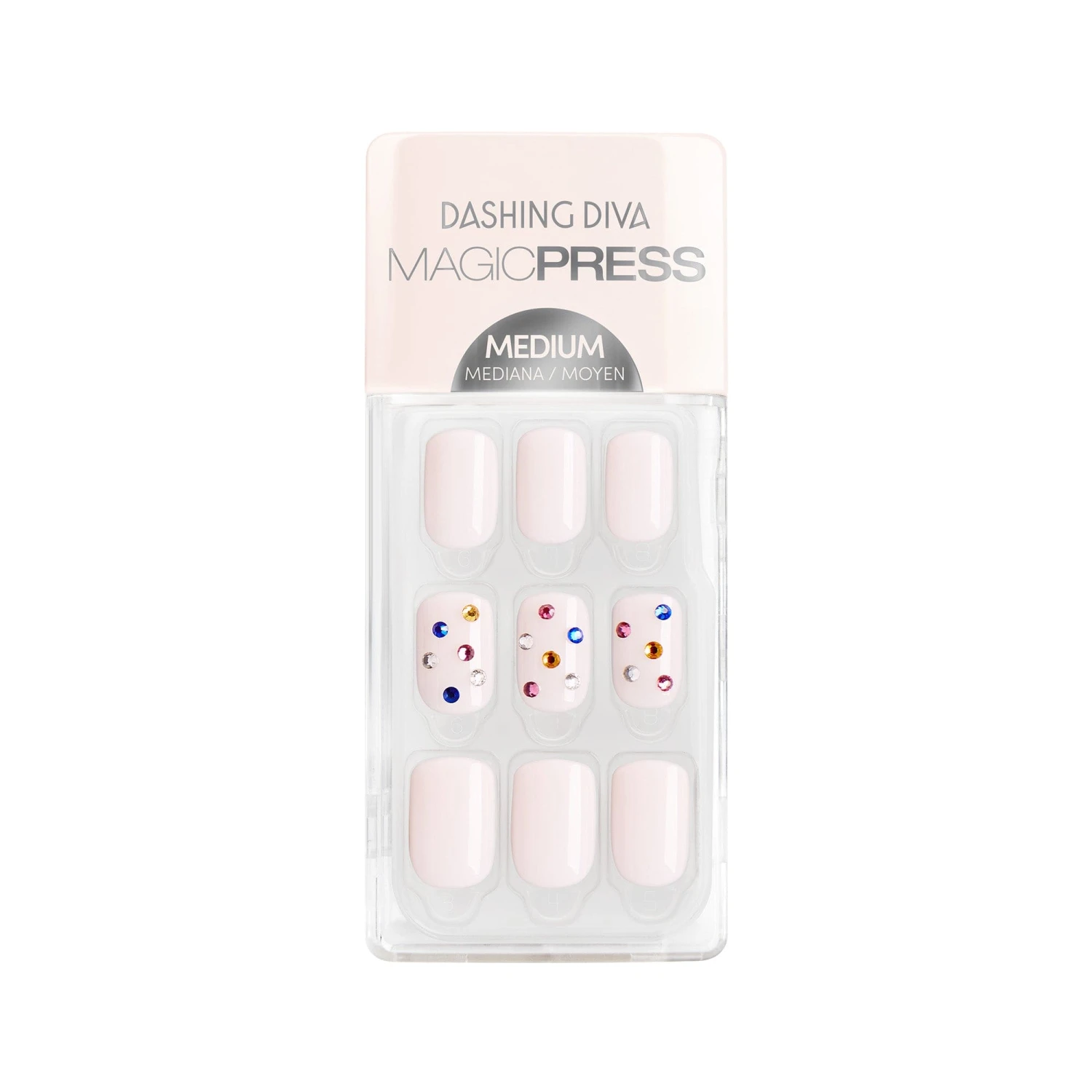 Sun goes down, music goes up. Medium length, square shape, glossy finish. Milky white press-on gel nails featuring multicolor gems.
