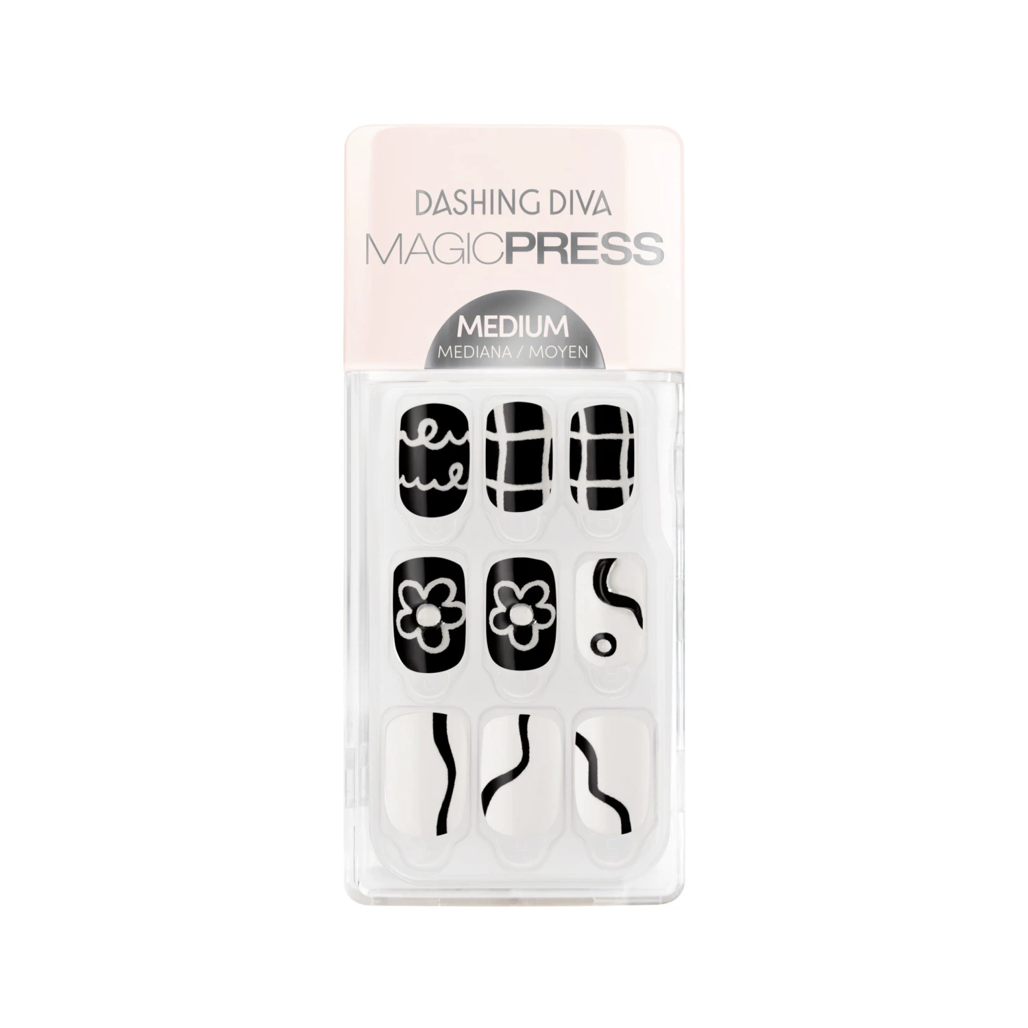 Medium length, square shape, glossy finish black & white press-on gel nails featuring wavy abstract line art and doodle sketch accents.