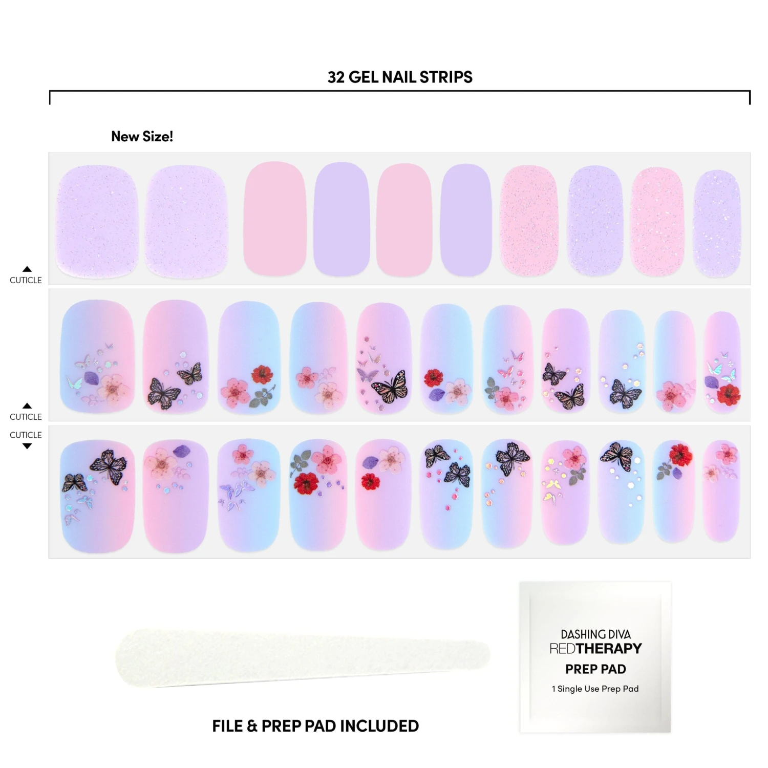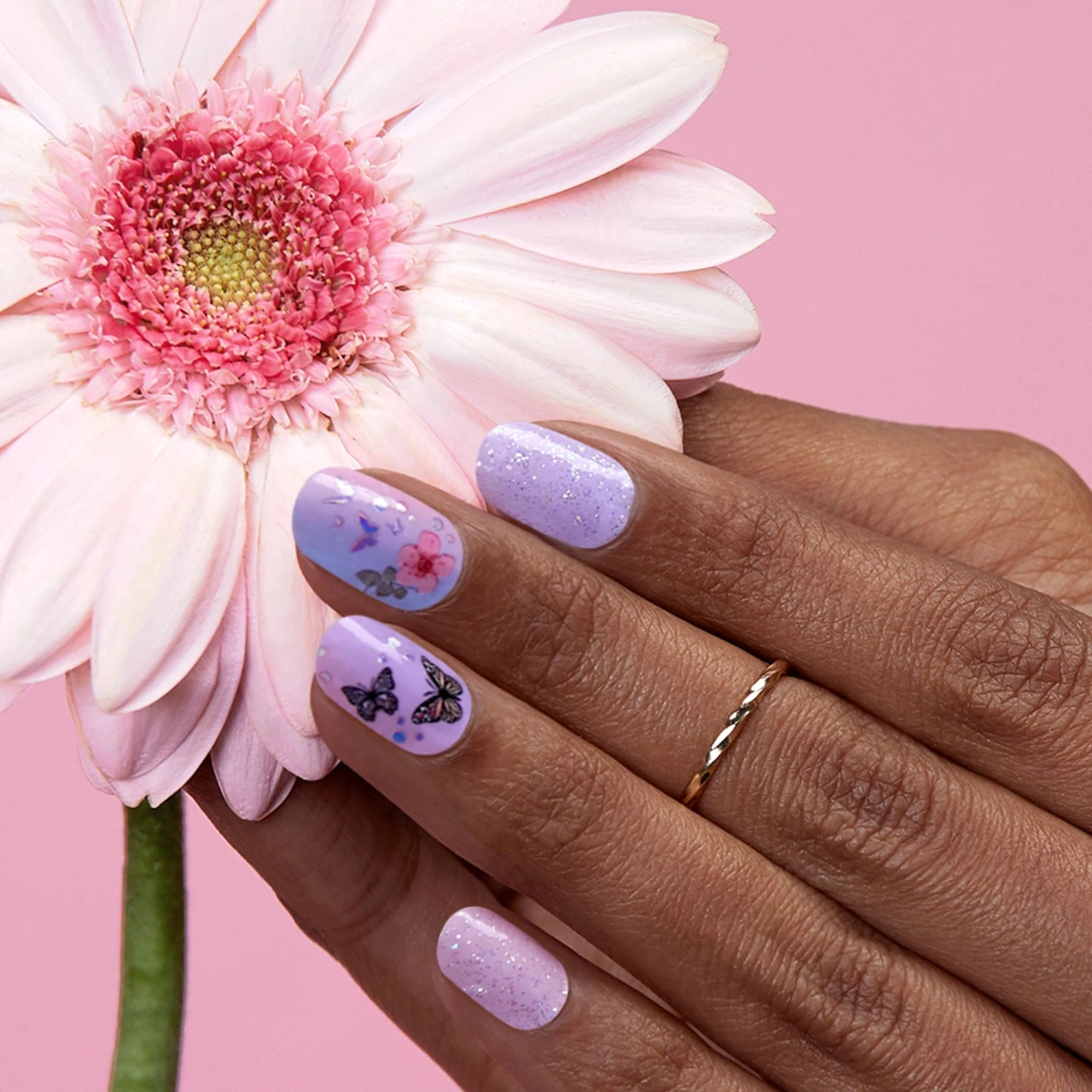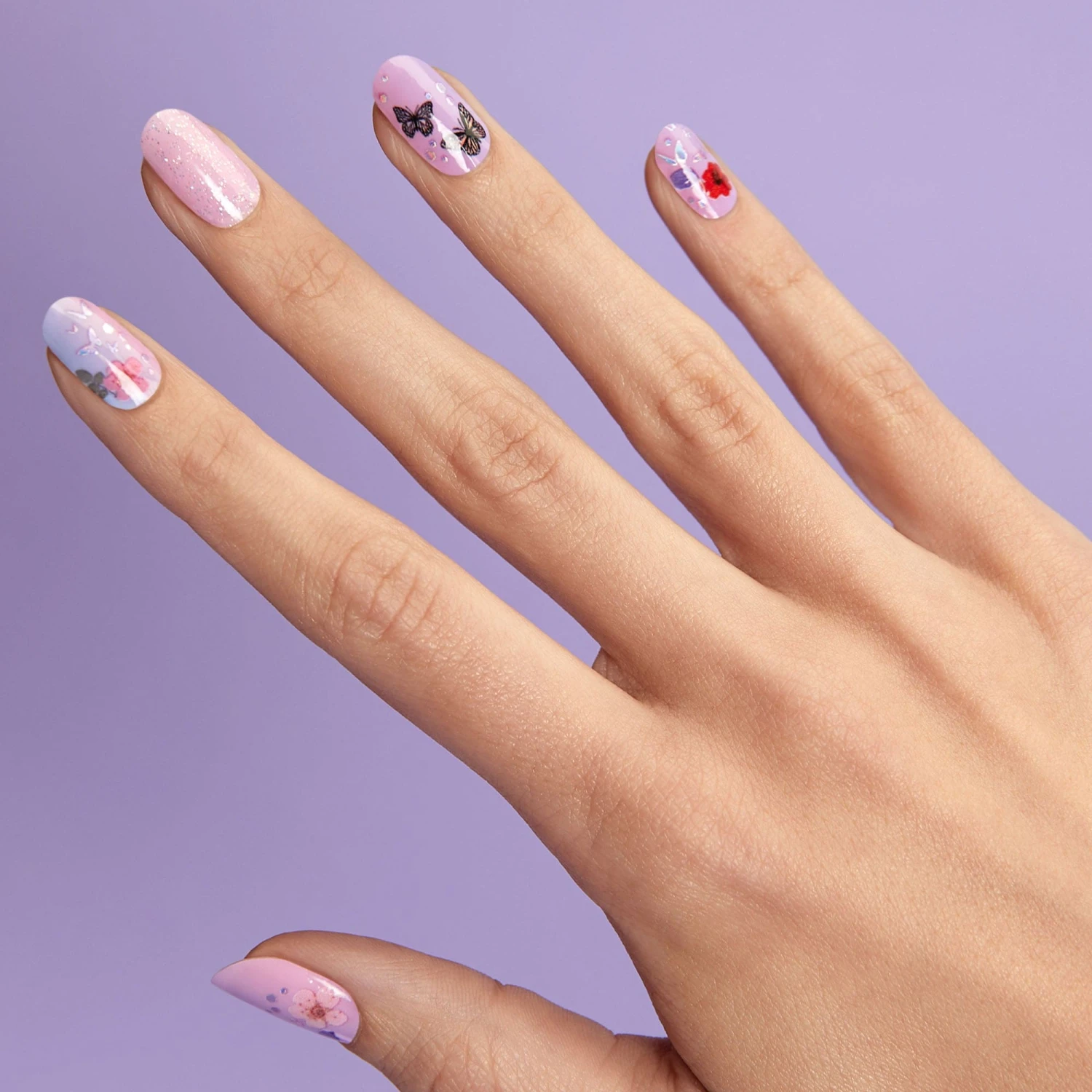 Gradient pink, purple, and blue gel nail strips featuring metallic butterflies and pressed flower accents with a glossy, high-shine finish.