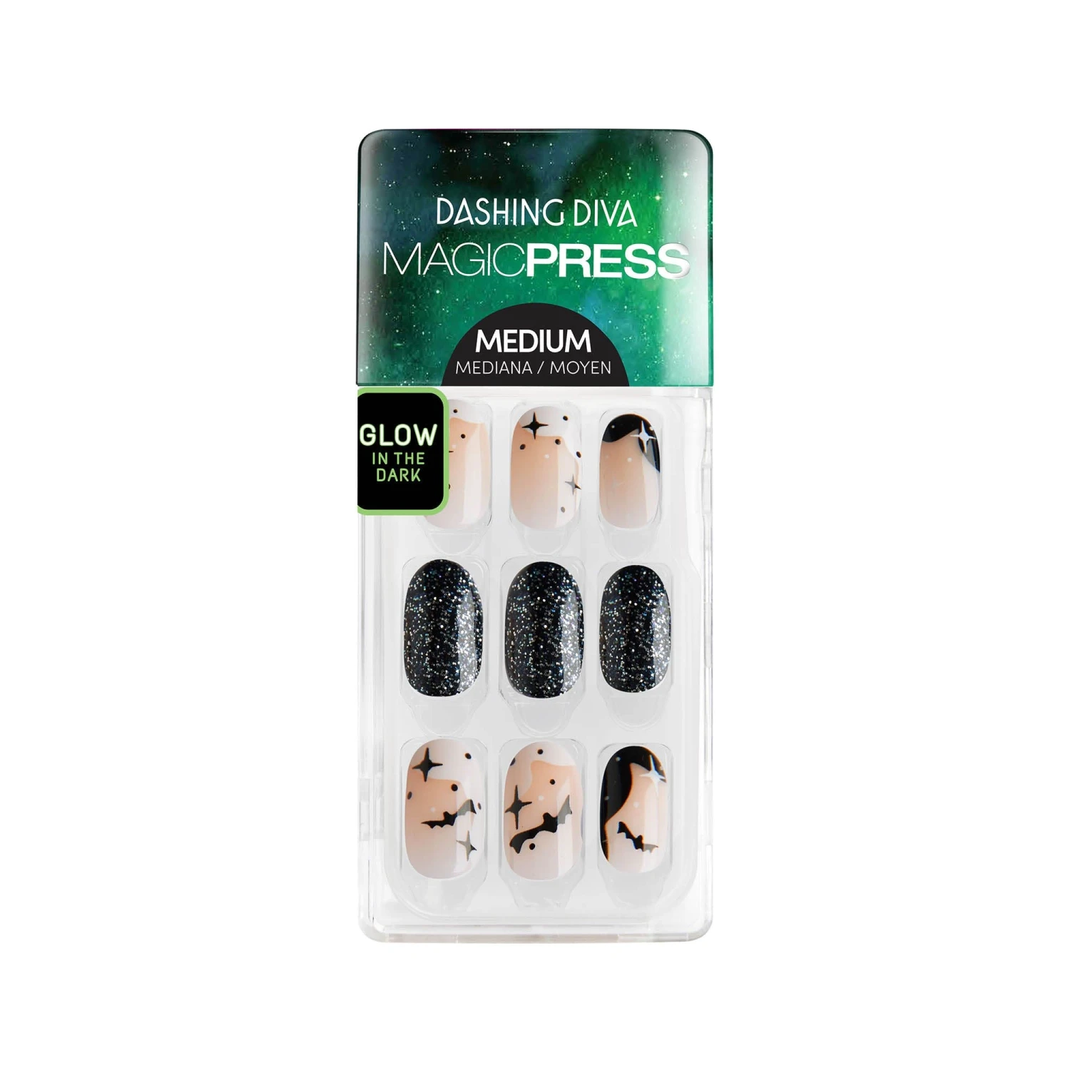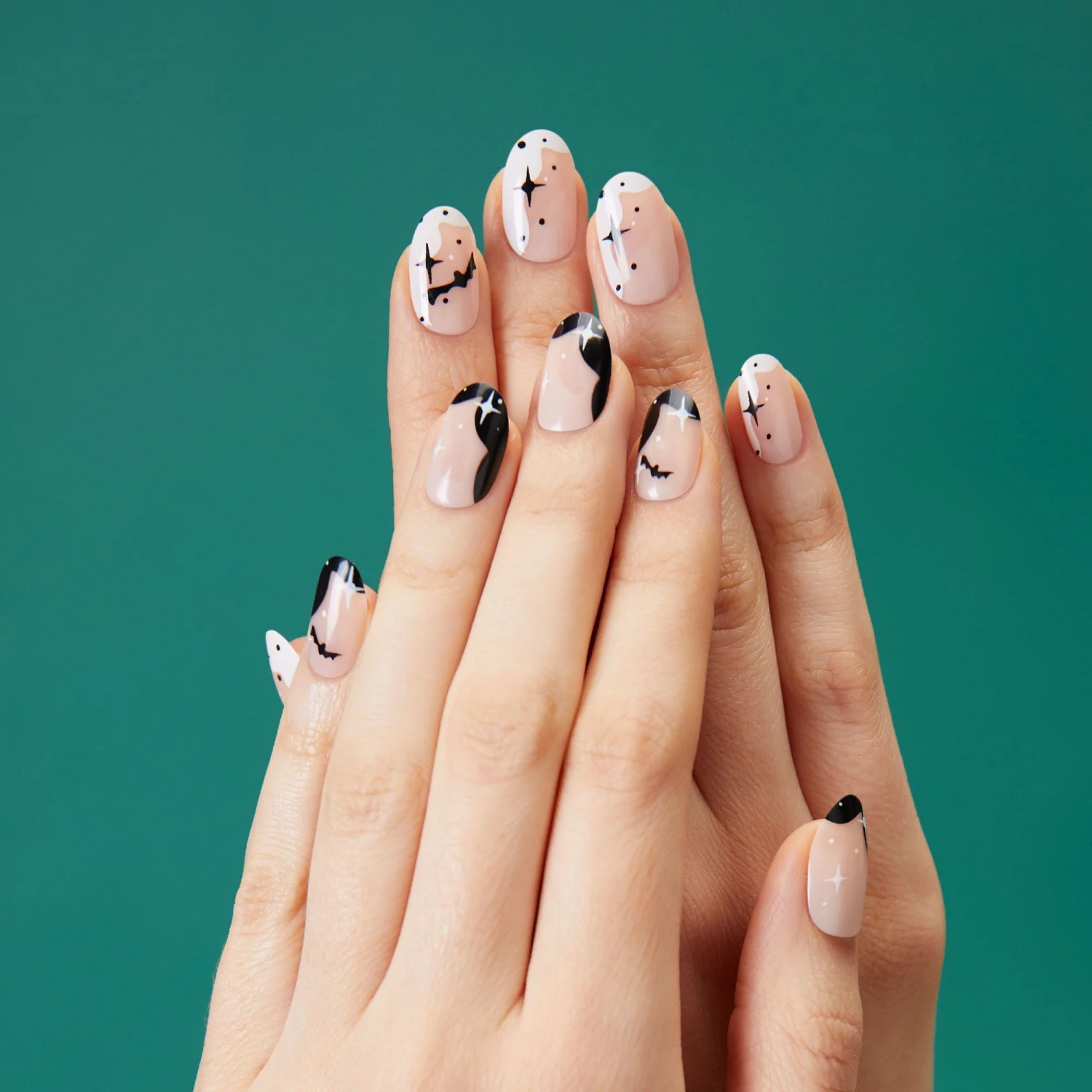Haunting? Maybe. Enchanting? Undeniably. Medium length, oval shape, glossy finish press-on gel nails featuring scalloped white and black French tips, silver glitter, and bat icons. Glow in the dark details.