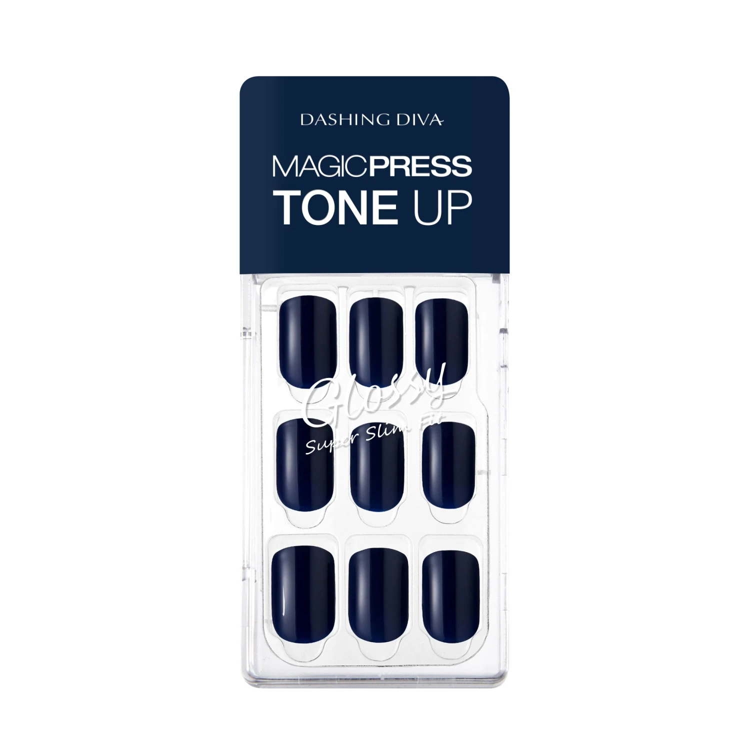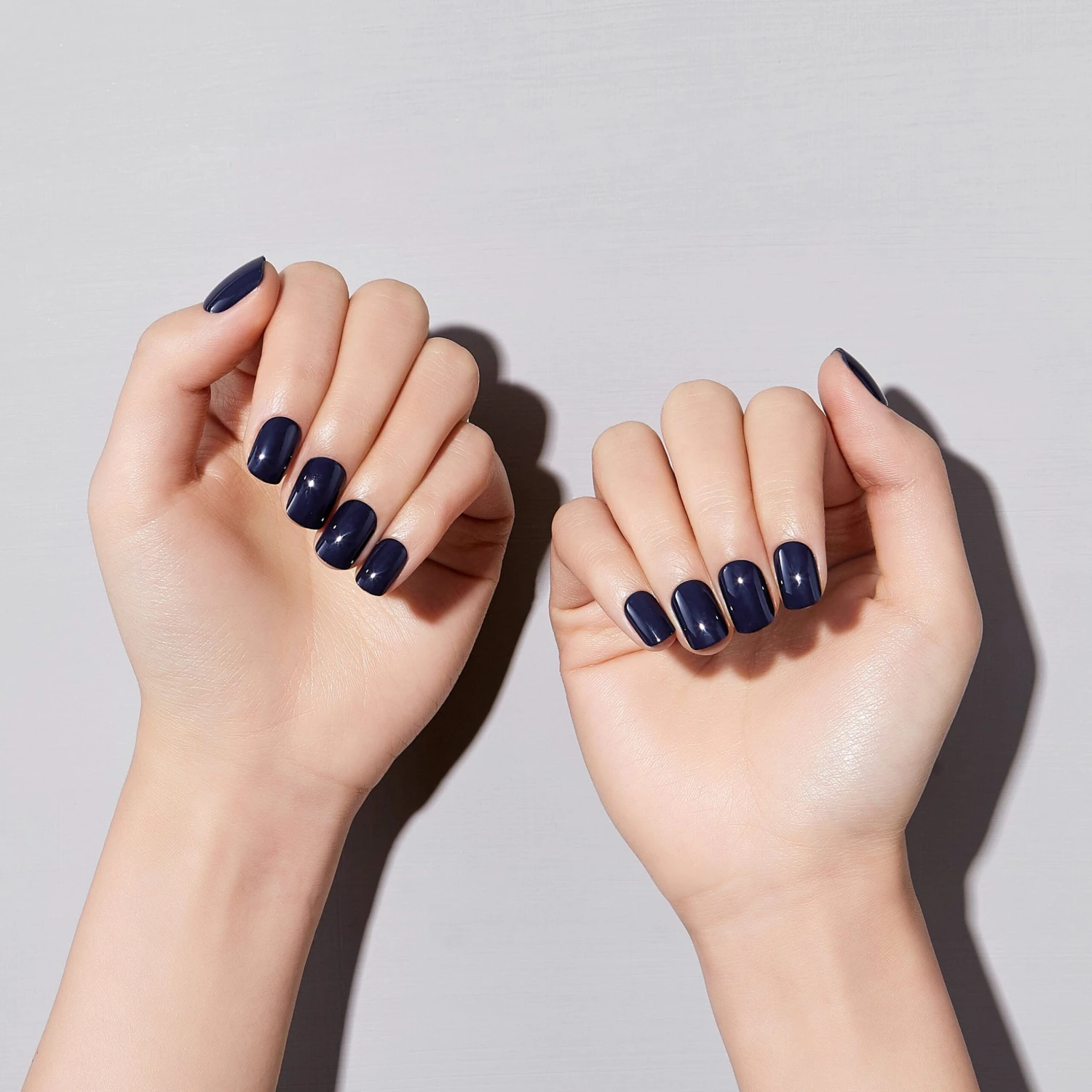 Medium length, square shape, glossy finish press-on gel nails. Switch out your go-to dark manicure with a sharp night time navy!