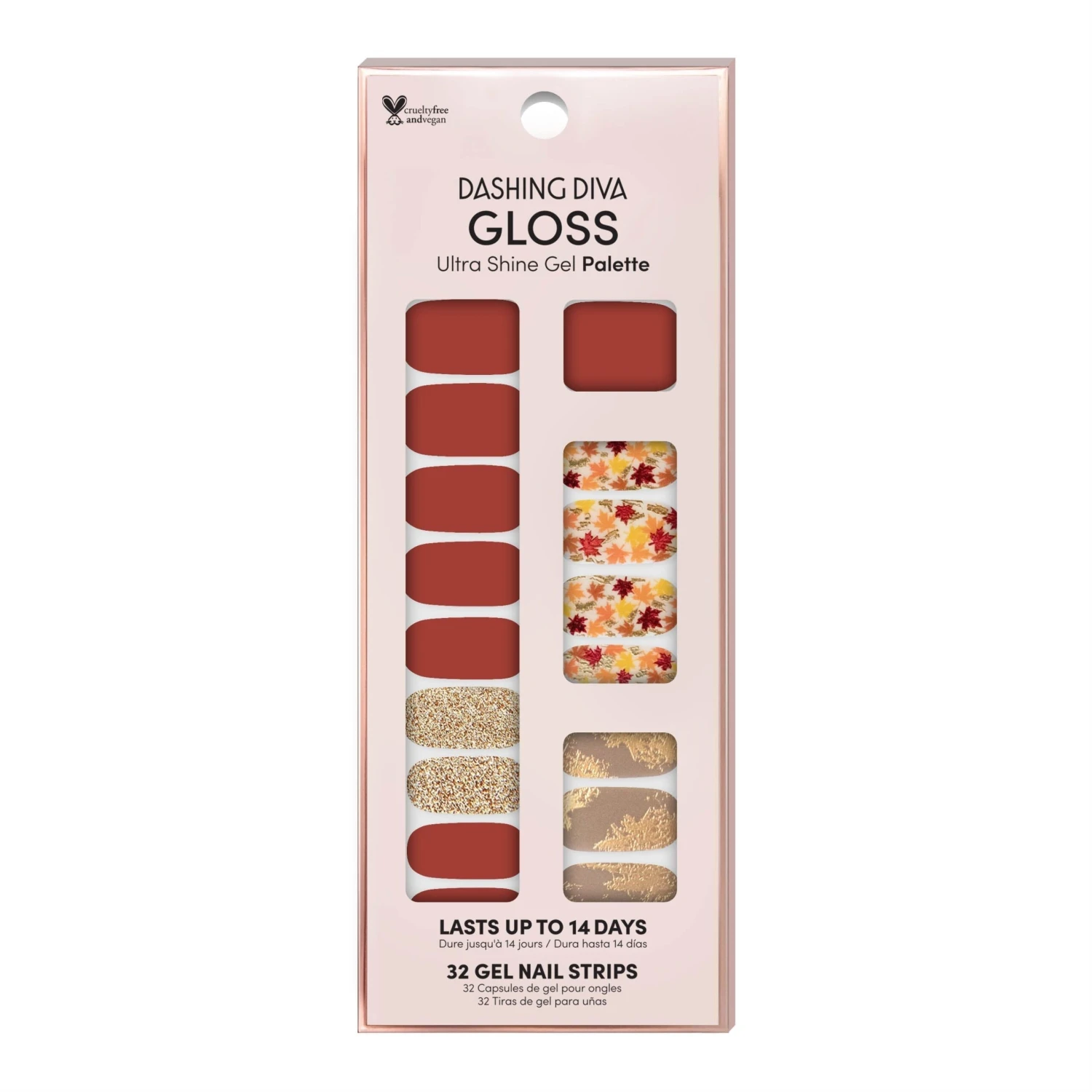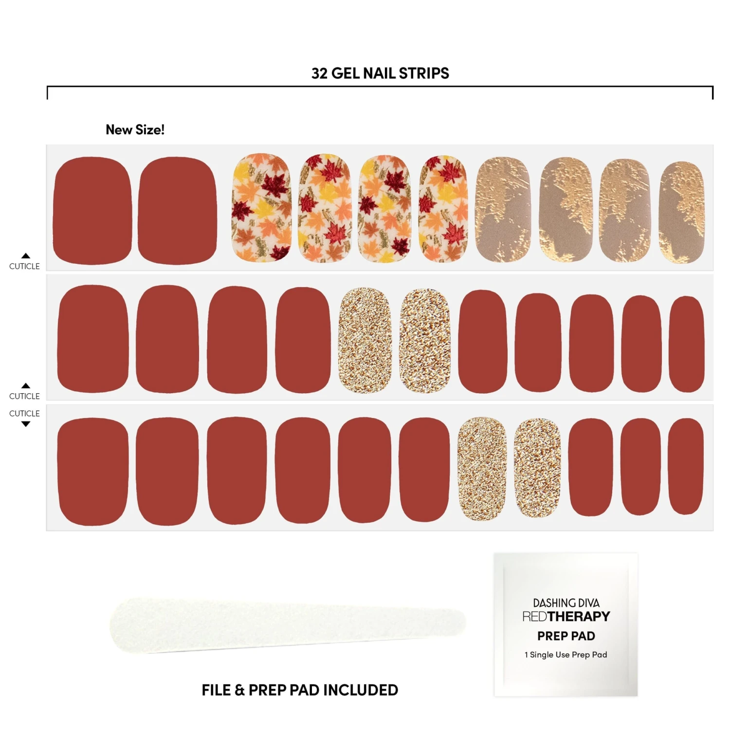 Auburn gel nail strips featuring gold glitter, gold foil, & multicolor fallen leaf accents.