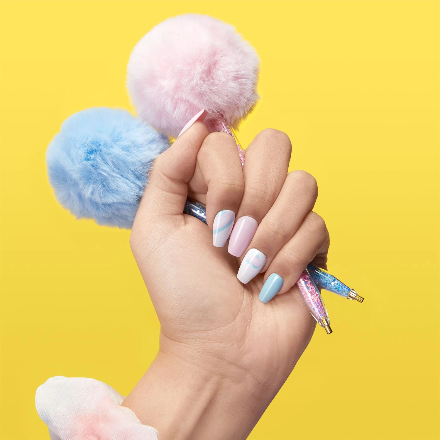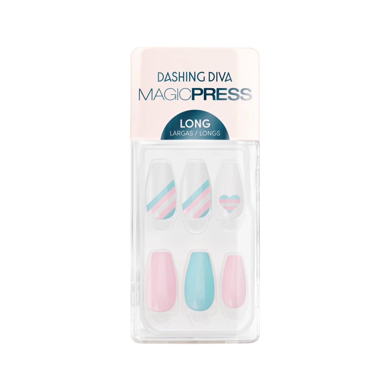 Long length, coffin shape, glossy finish white press-on gel nails featuring baby pink & light blue heart and stripe accents.