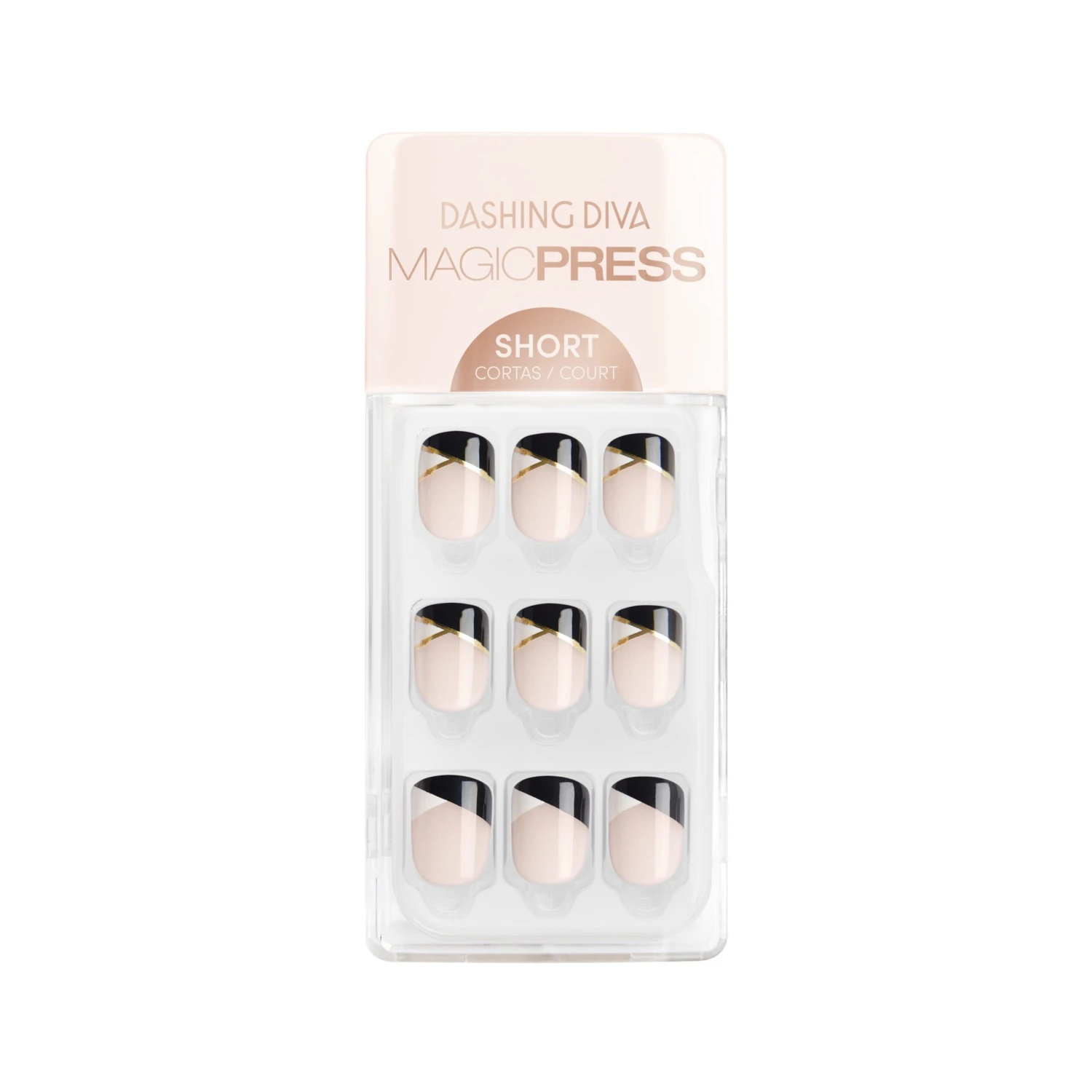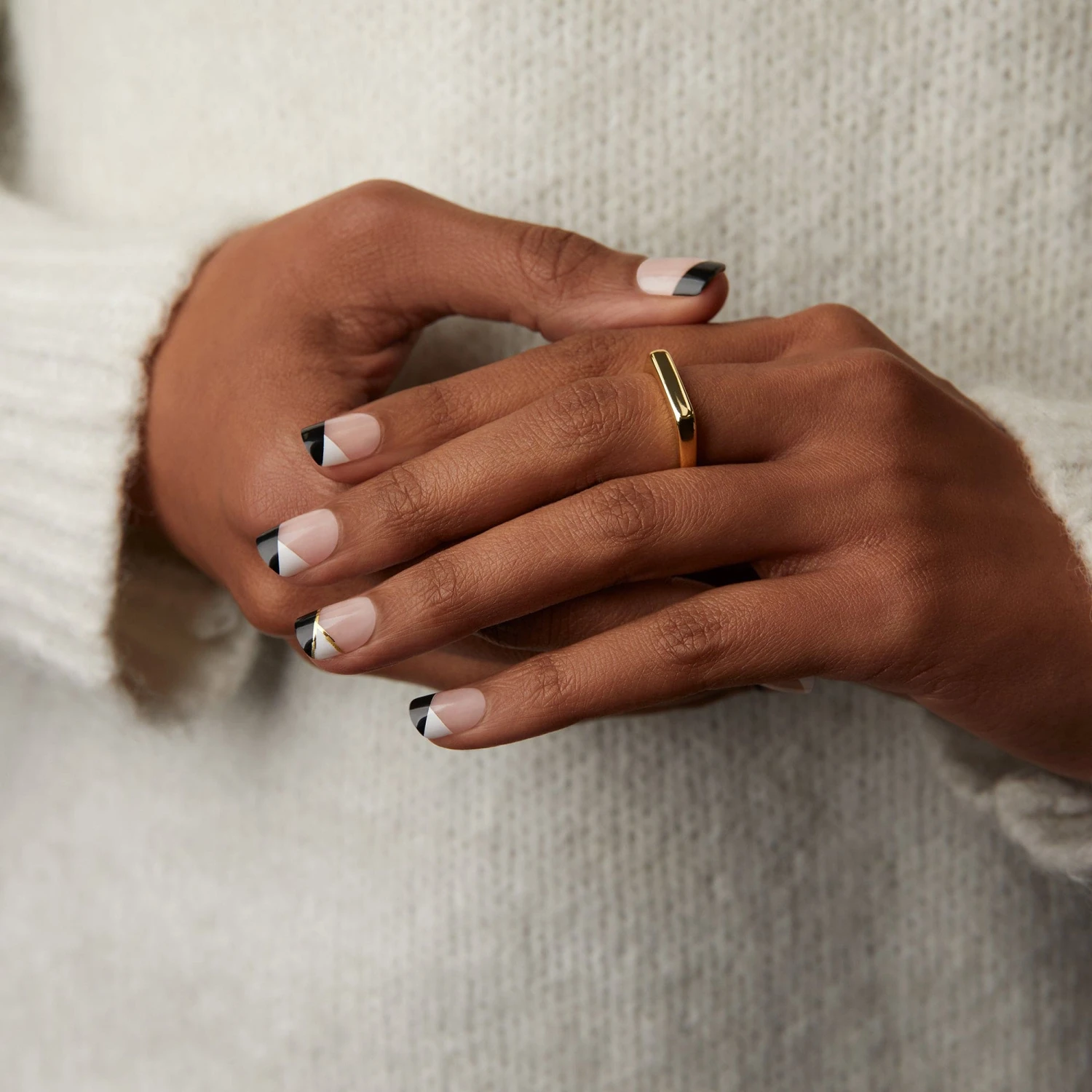 Short length, square shape, glossy finish. Semi-sheer nude press-on gel nails featuring black & white french tips with gold foil detailing.