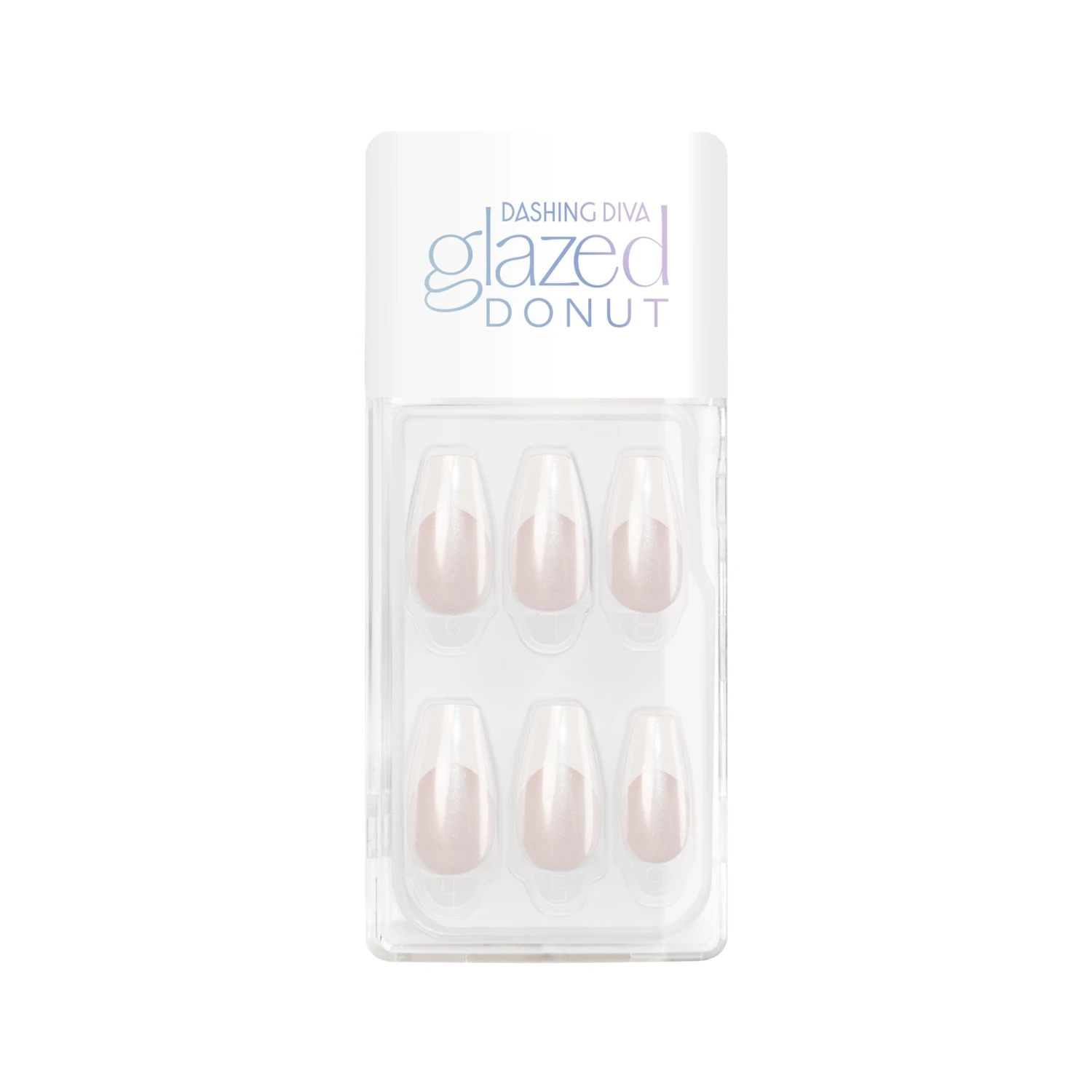 Silver French tip press-on gel nails featuring, medium length, coffin shape, and a shimmery chrome finish.