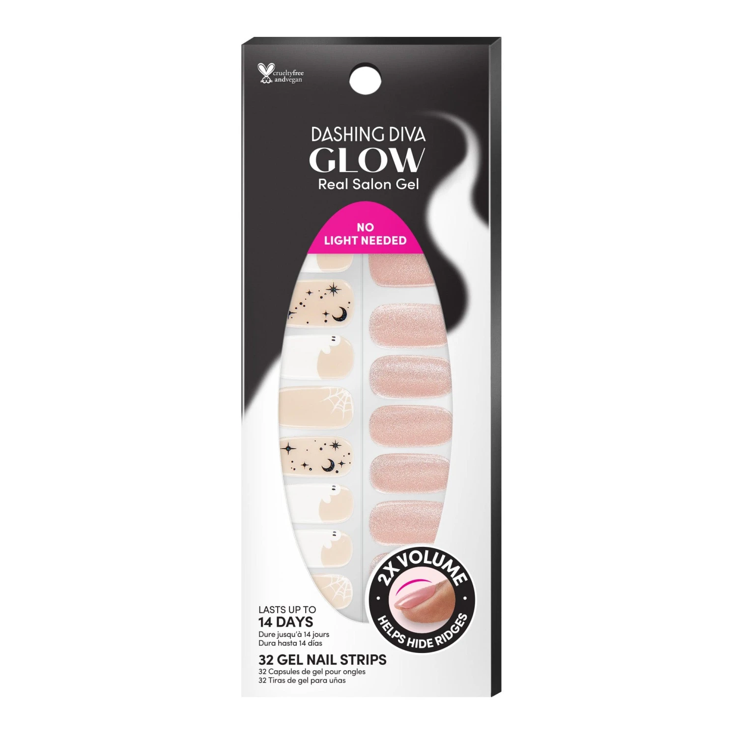 Nude gel nail strips featuring ghost french tips, starry accents, iridescent glitter, and a nude pink shimmery velvet effect with a double gel formula for an ultra-smooth finish.