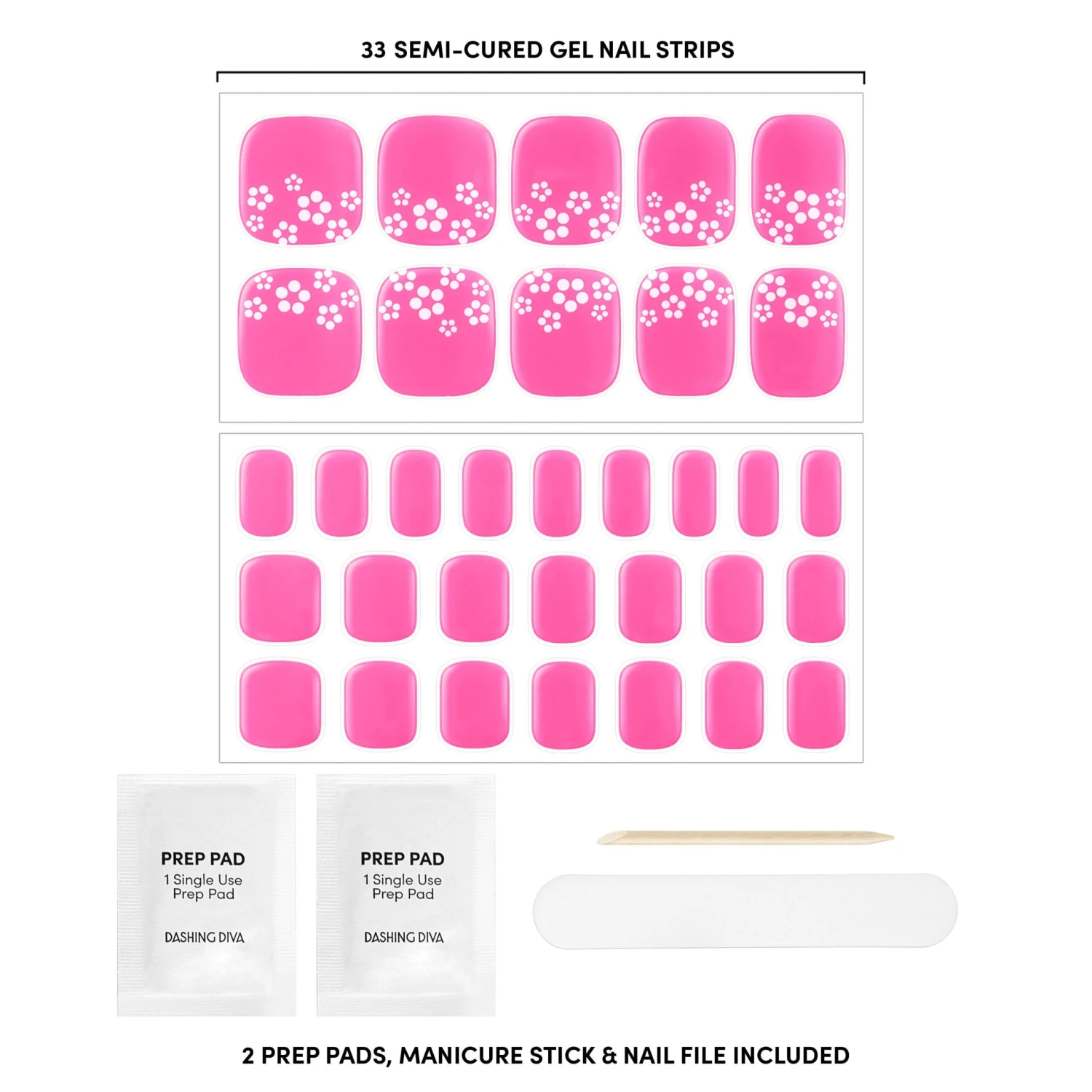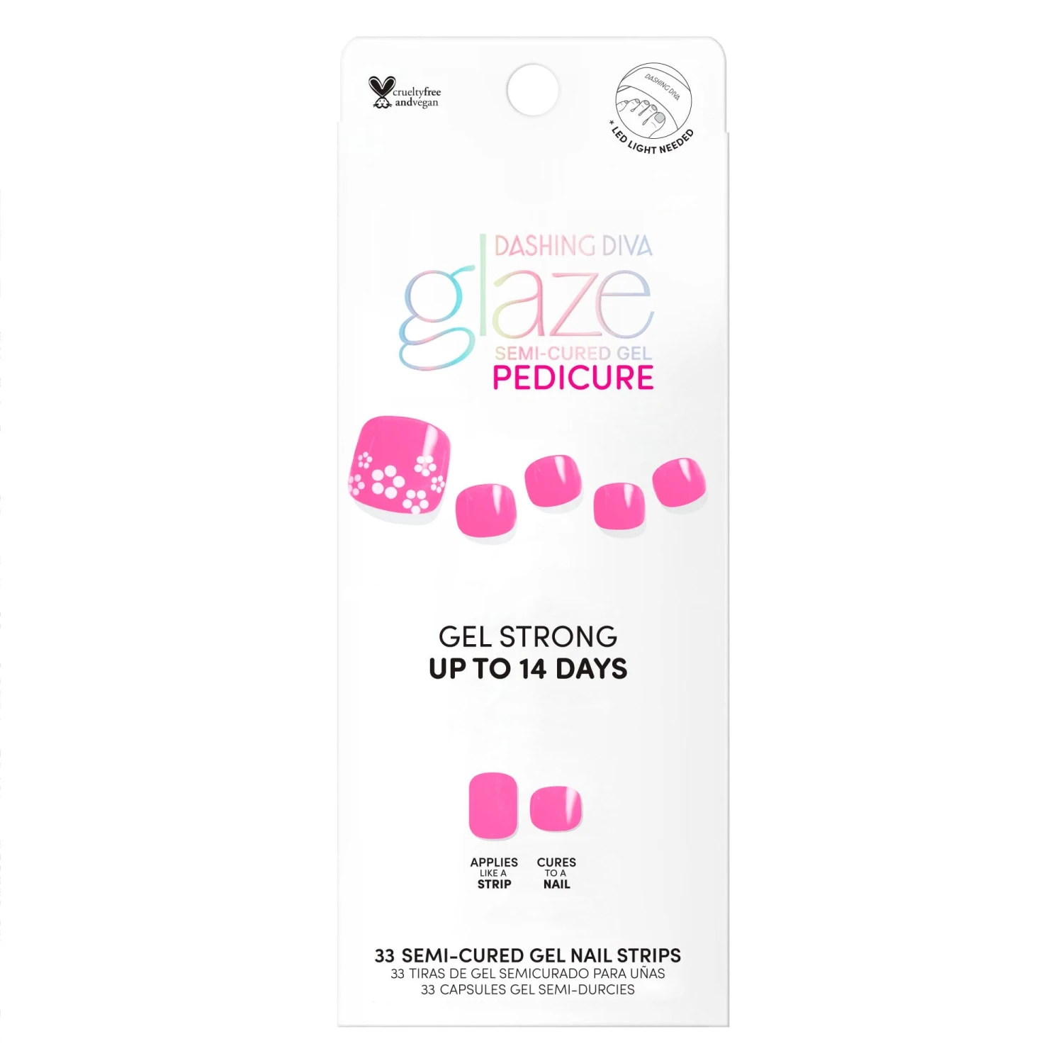 Semi-cured neon pink gel pedicure strips featuring pop floral accents with mega volume & maximum shine.