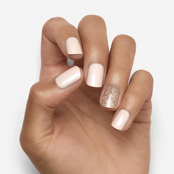 Medium length, square shape, glossy finish peachy nude press-on gel nails featuring rose gold glitter.