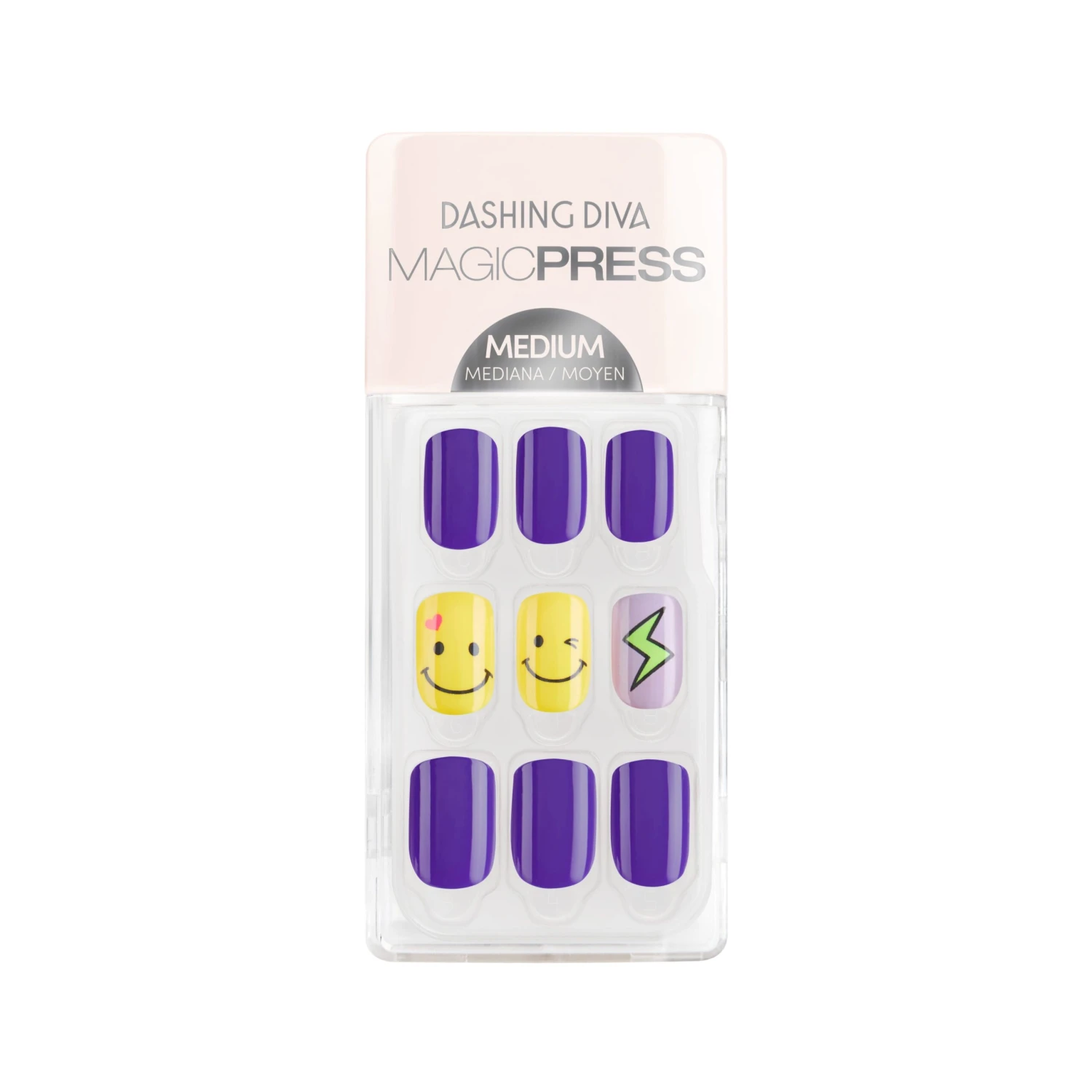 A grape manicure to match your Grape Smile! Medium length, square shape, glossy finish purple & yellow press-on gel nails featuring hearts, smiley faces, and lightening icons.