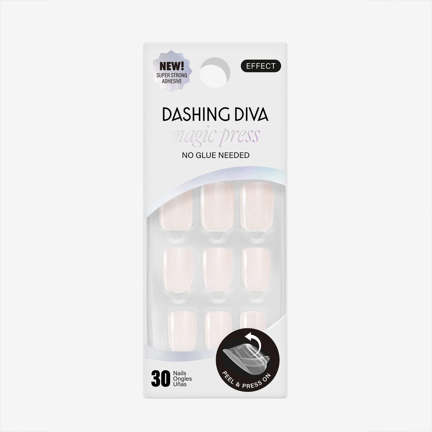 Just mani’d! Medium length, square shape, glossy finish. White press-on gel nails featuring a velvet shimmer finish.
