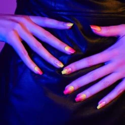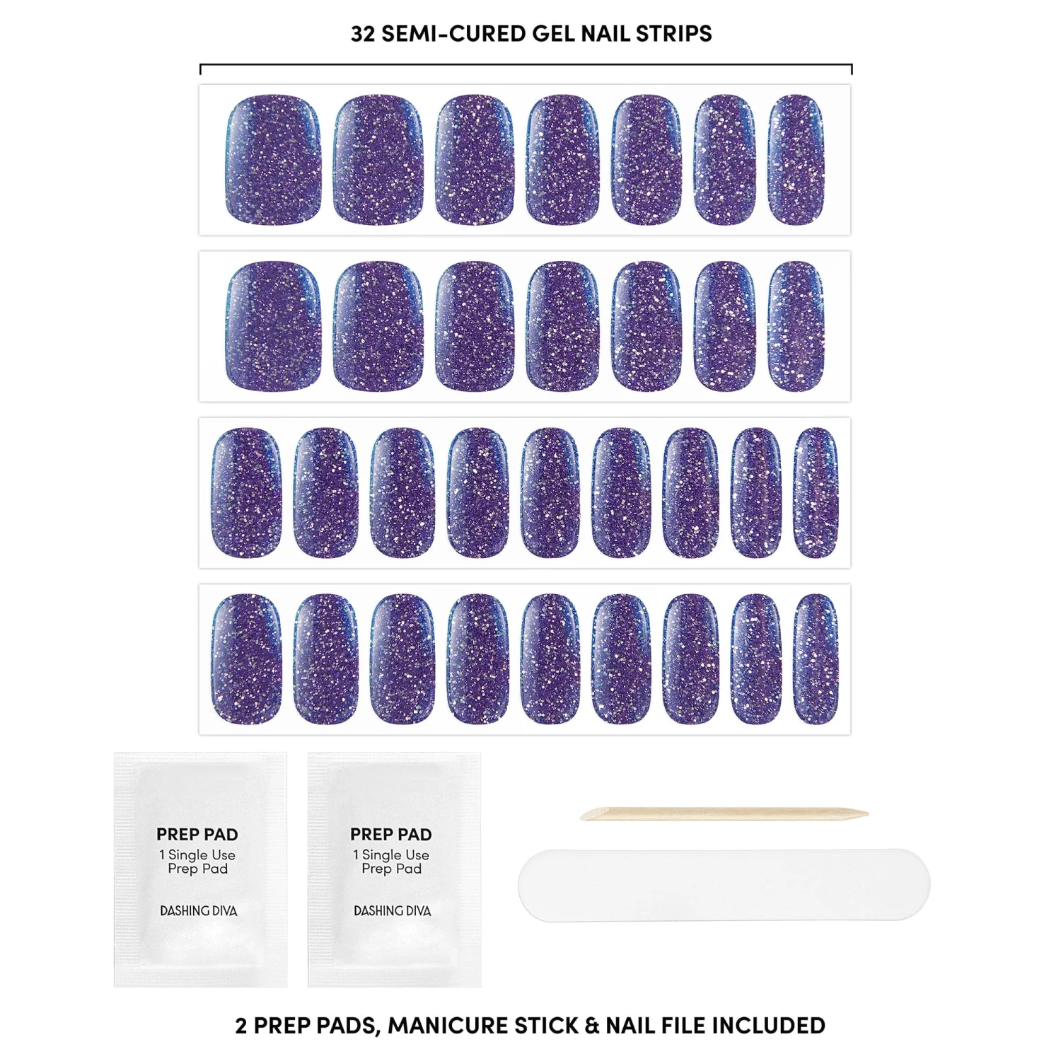 It’s getting haute in here… Semi-cured purple gel nail strips featuring gold glitter and an iridescent chrome finish with mega volume & maximum shine.
