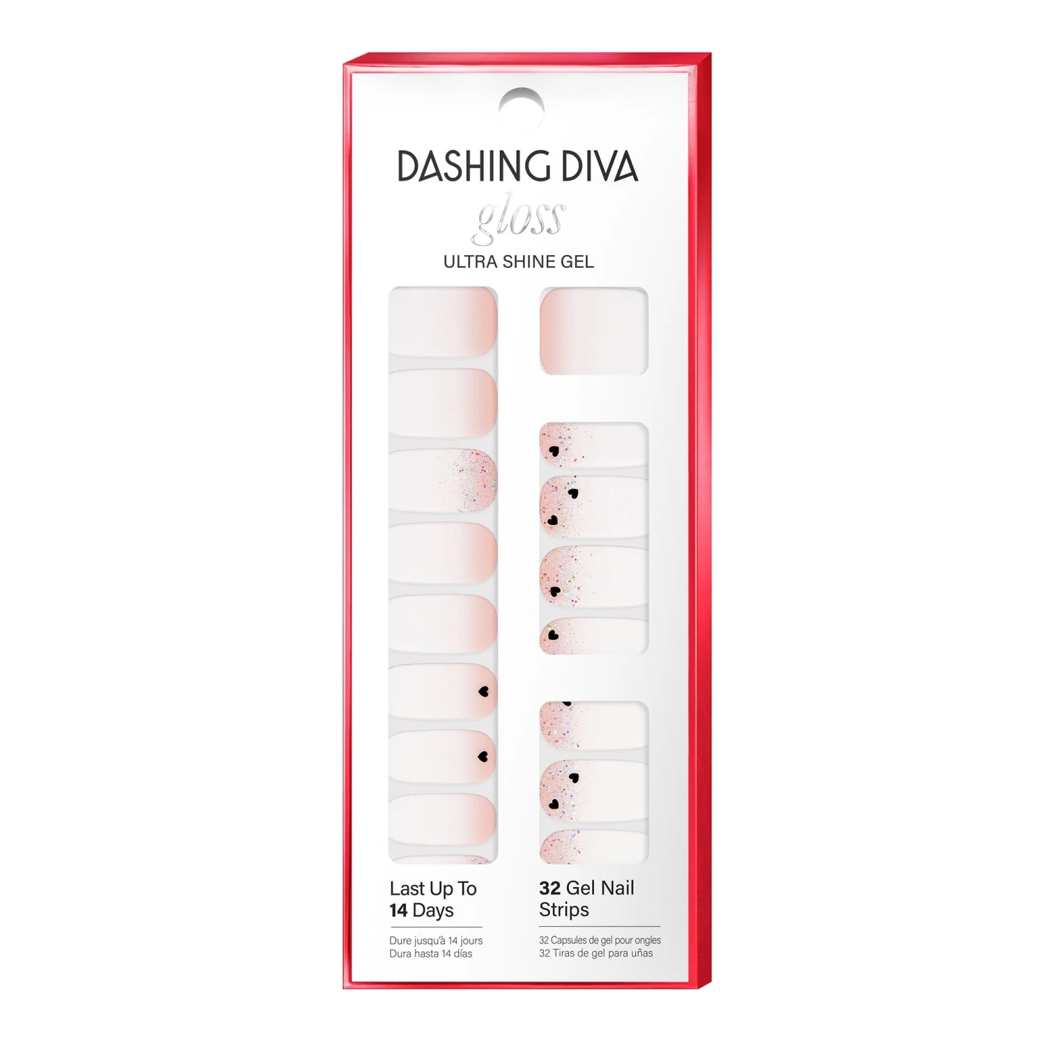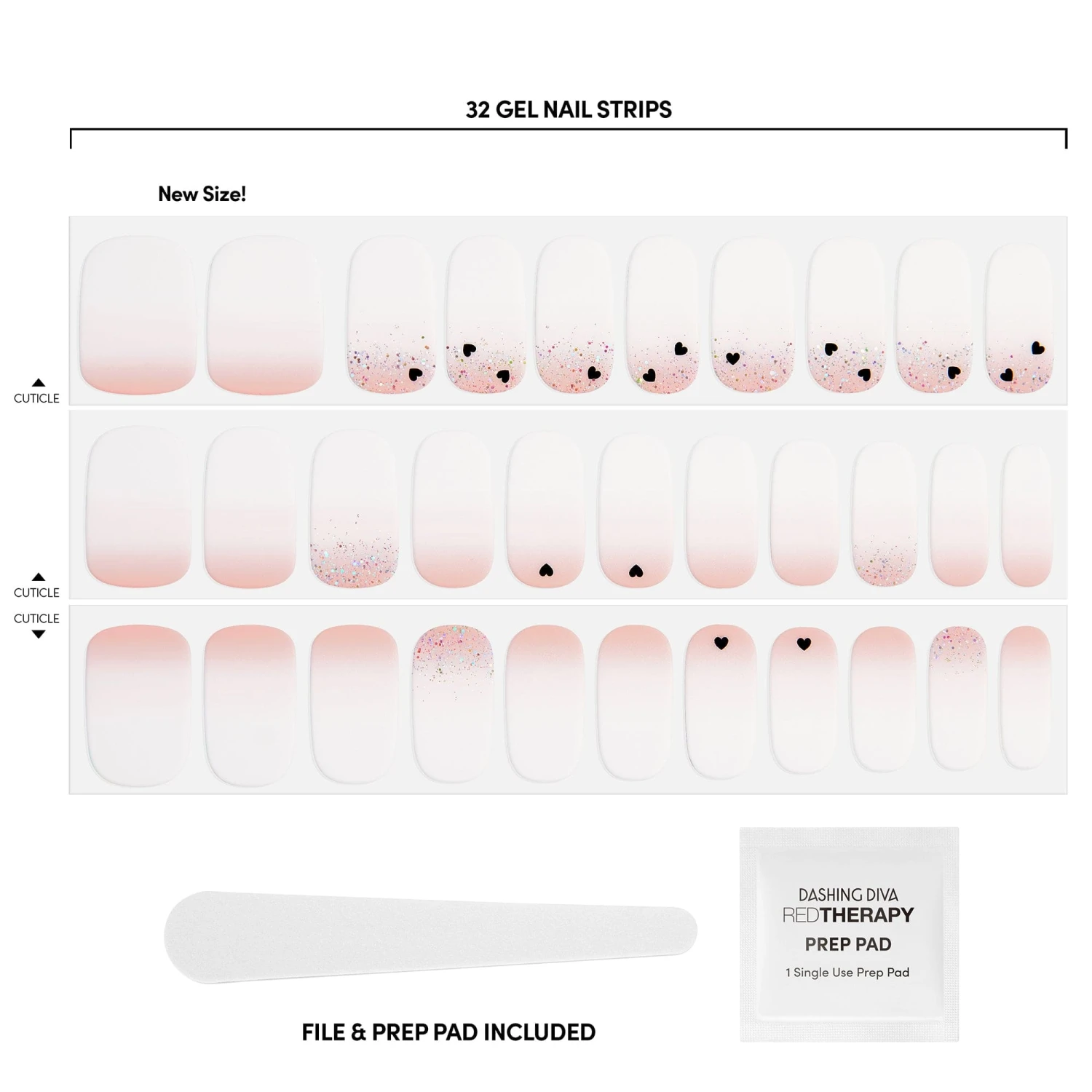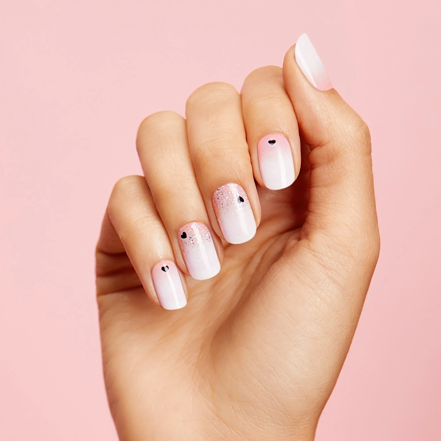 Don’t trip. White gel nail strips featuring a soft pink ombré, black hearts, and iridescent glitter with a glossy, high-shine finish.