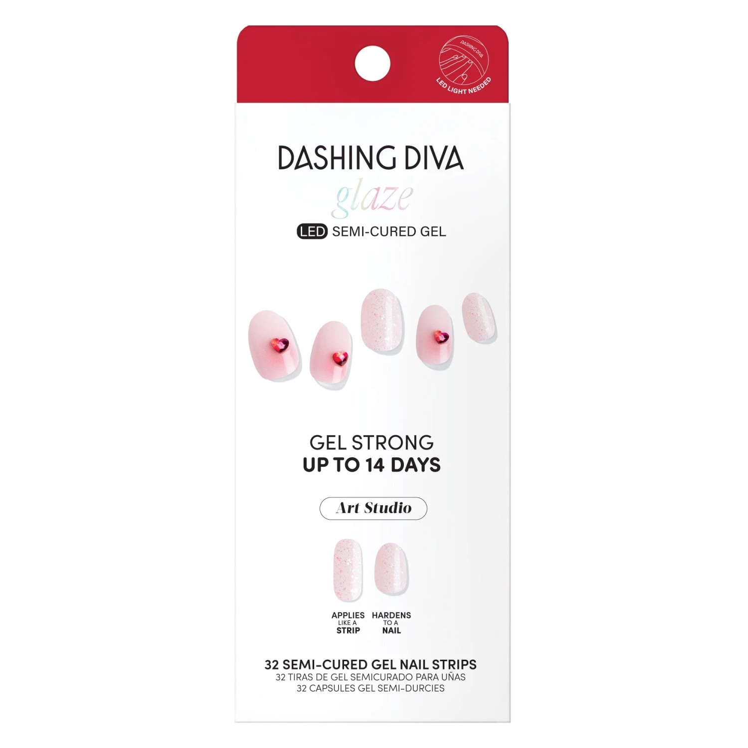Glam even when you’re going through it. Semi-cured nude pink gel nail strips featuring iridescent glitter, heart-shaped gems, and red ombré accents with mega volume and maximum shine.