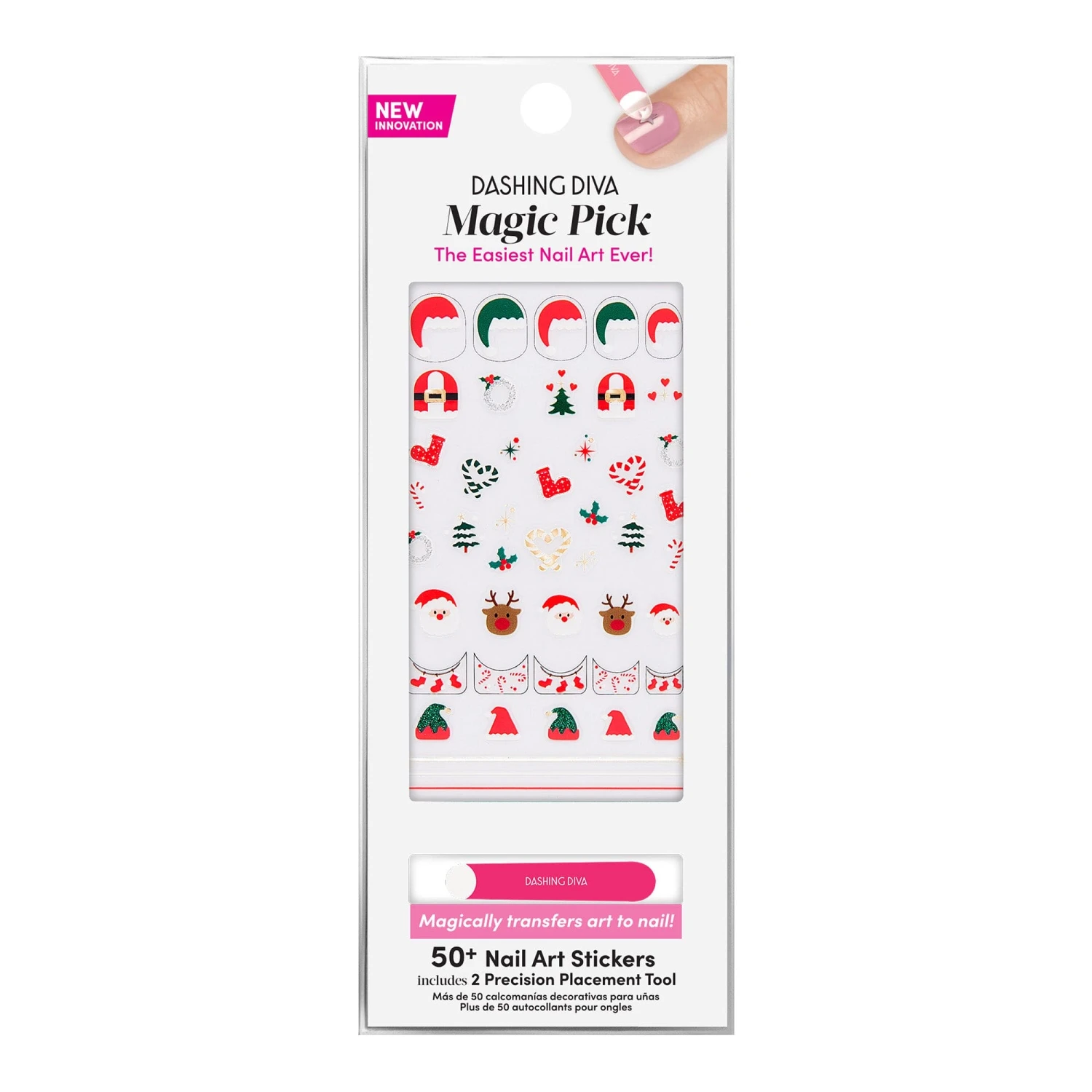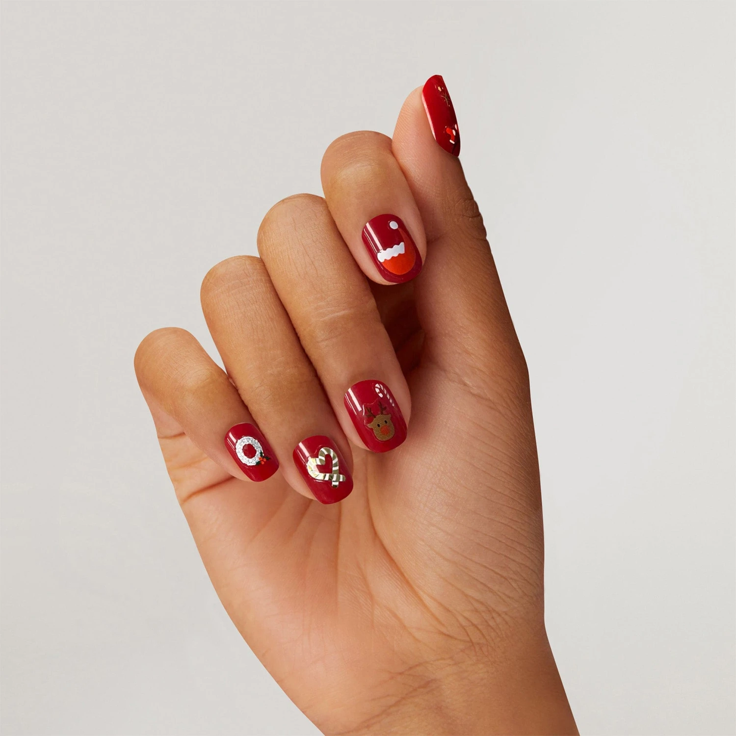 A toast—to the prettiest mani at the holiday party. Premium nail art stickers featuring santa, reindeer, candy canes, stockings, santa hat french tips, and so much more!