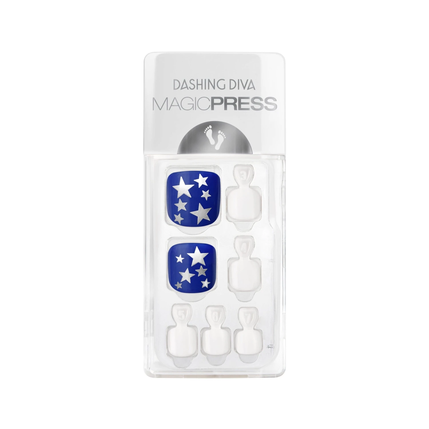 Press-on pedicure gel nails with easy application and comfortable wear. This Independence Day, wear this navy and white star spangled pedicure for both festivity and glamour!