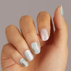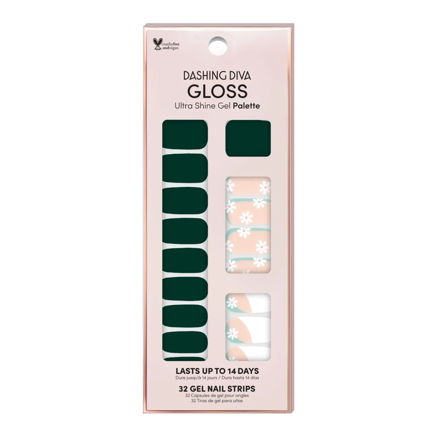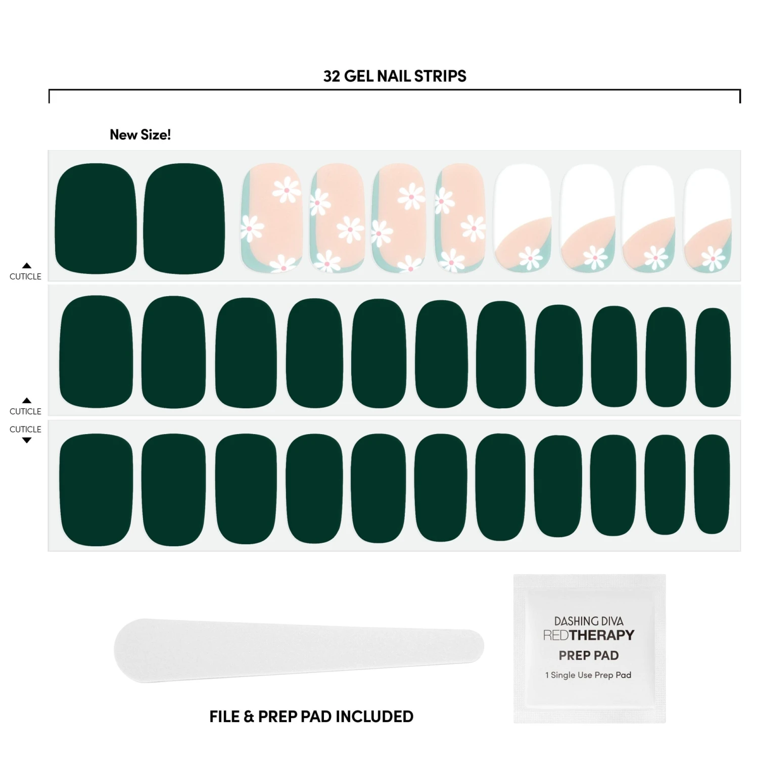 Dark green and nude nail strips featuring light green & white abstract color blocking and white daisy icons with a glossy, high-shine finish.