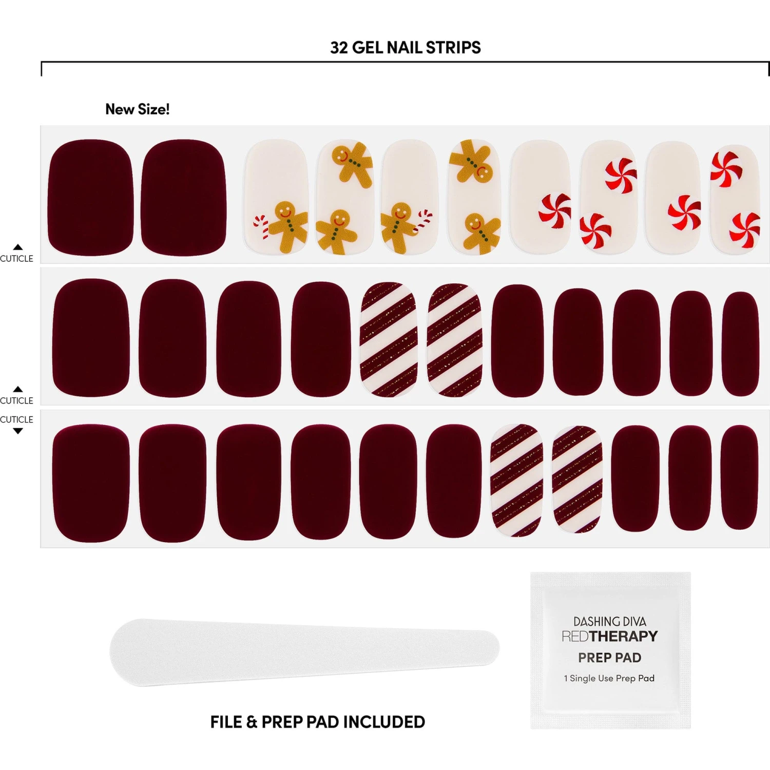 All in good fun, as always. Deep red and cream nail strips featuring gingerbread, candy canes, mints, and stripes with a glossy, high-shine finish.