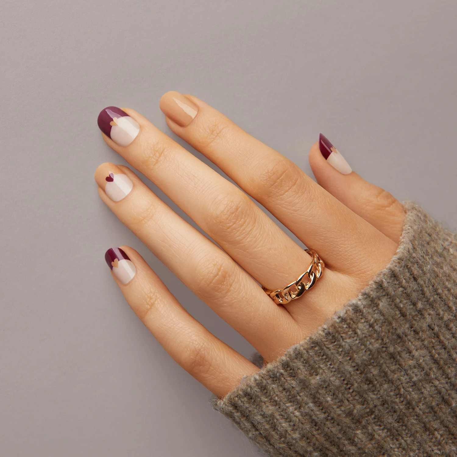 Sheer nude & burgundy gel nail strips featuring camel & burgundy french tips and heart icons with a double gel formula for an ultra-smooth finish.