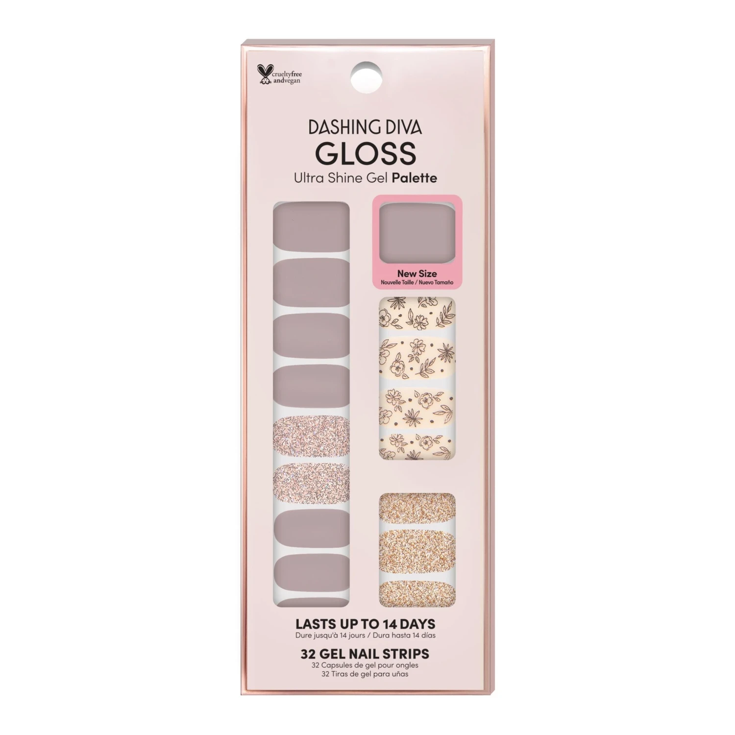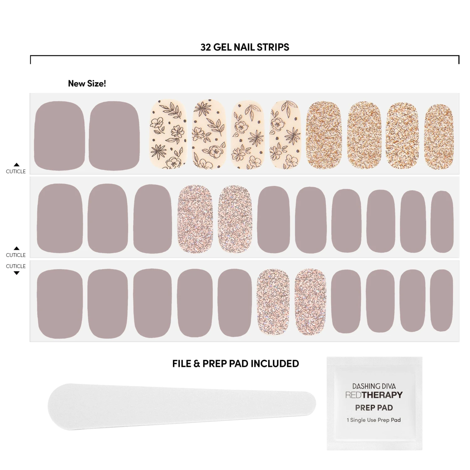 Gray-lavender & ivory gel nail strips featuring gold glitter, rose gold glitter, and foil flower accents with a glossy, high-shine finish.