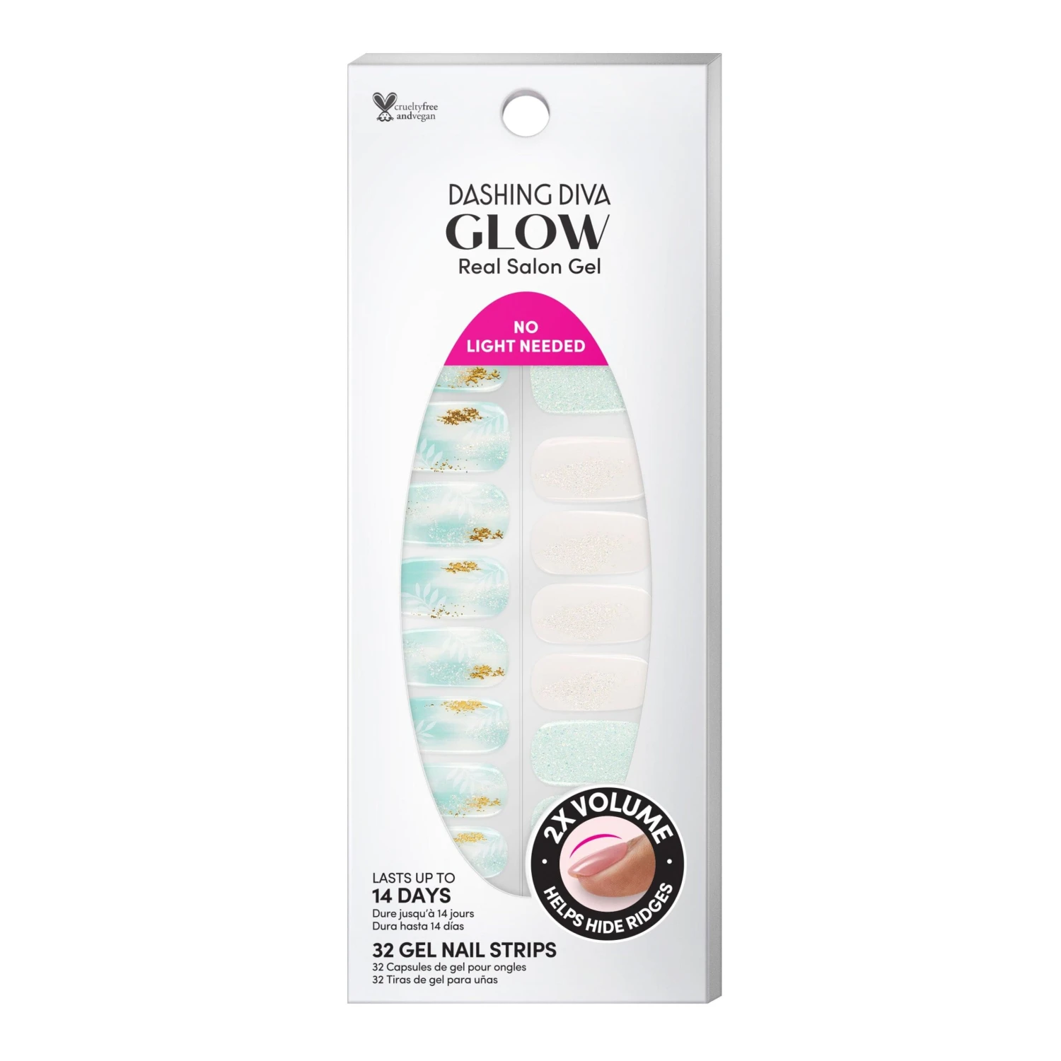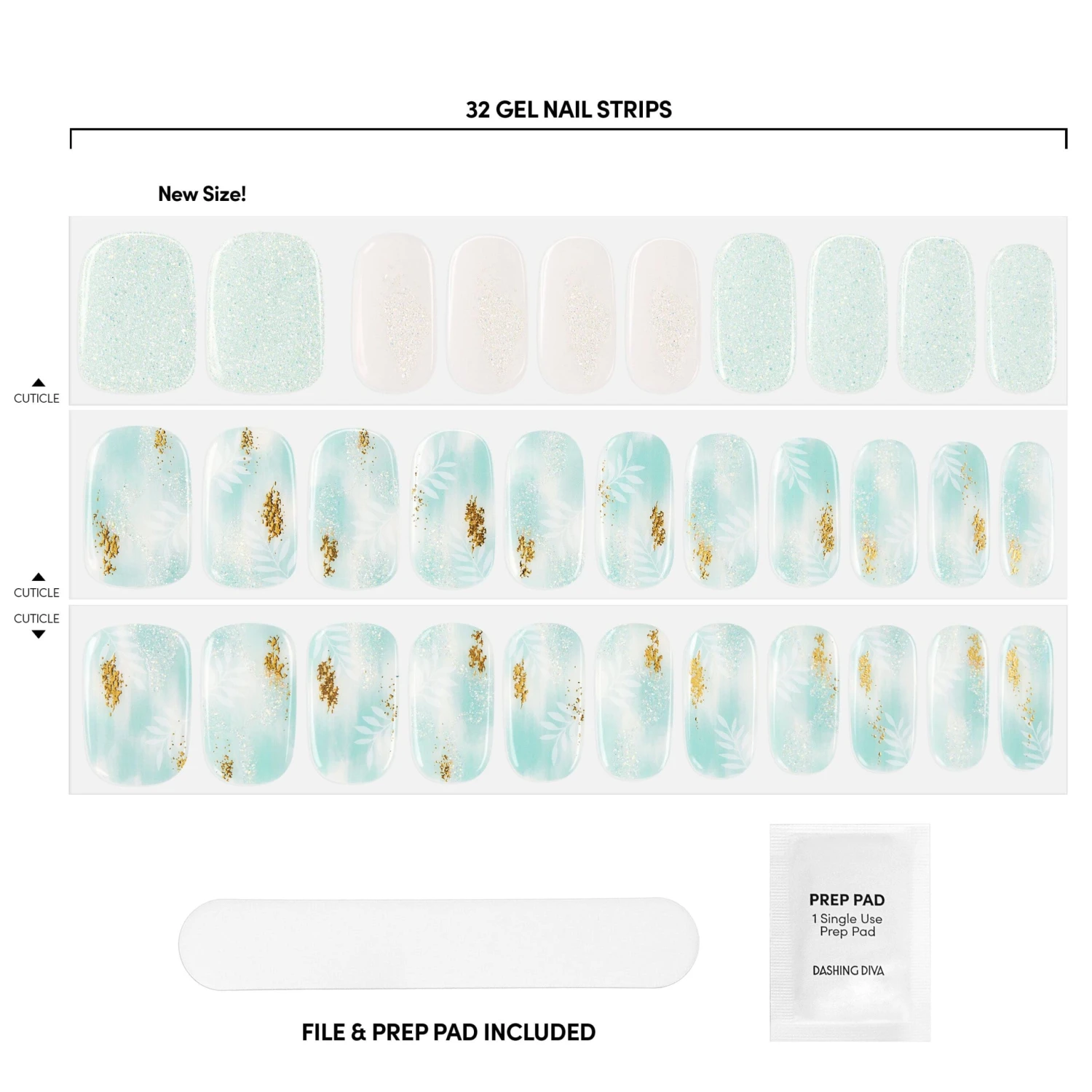 Off-white & soft green gel nail strips featuring white ivy accents, gold foil, and iridescent glitter with a double gel formula for an ultra-smooth finish.