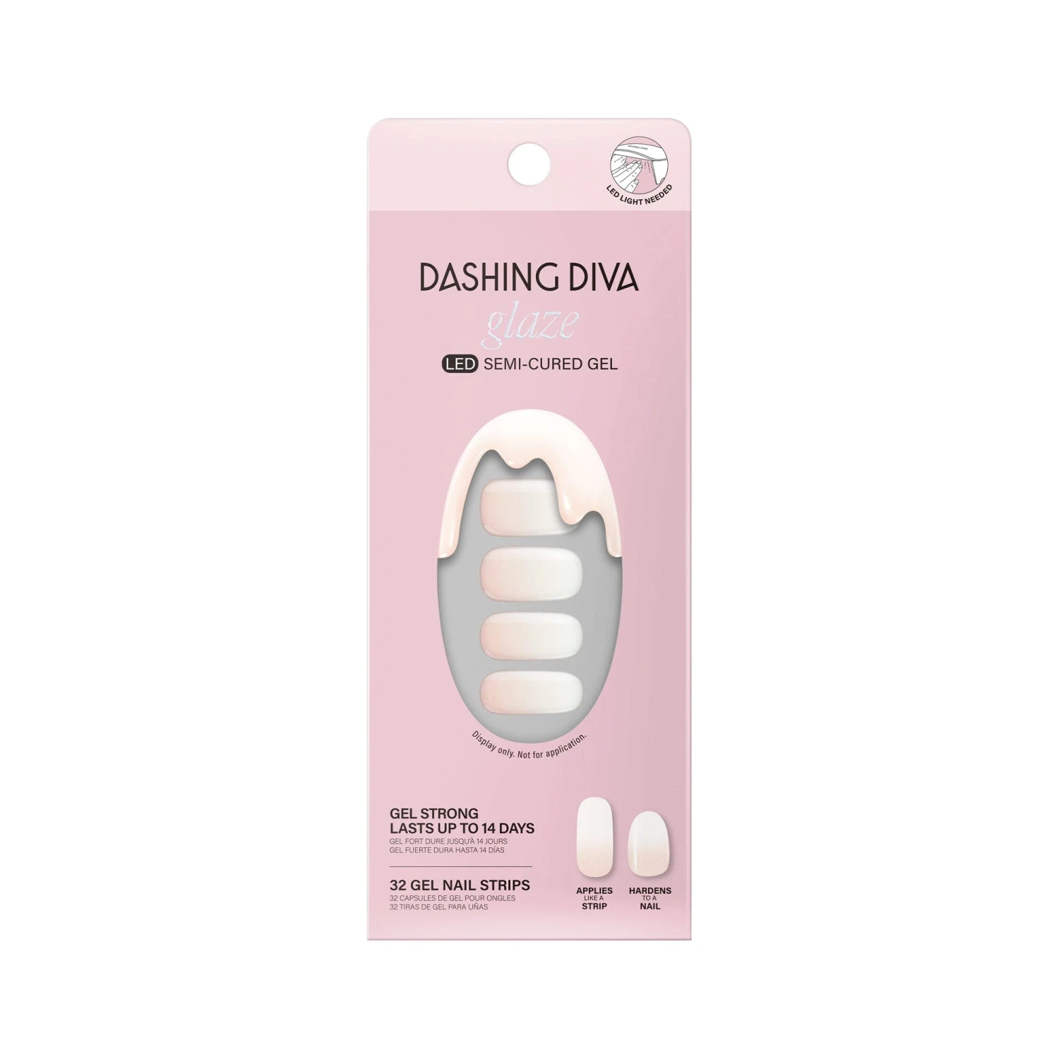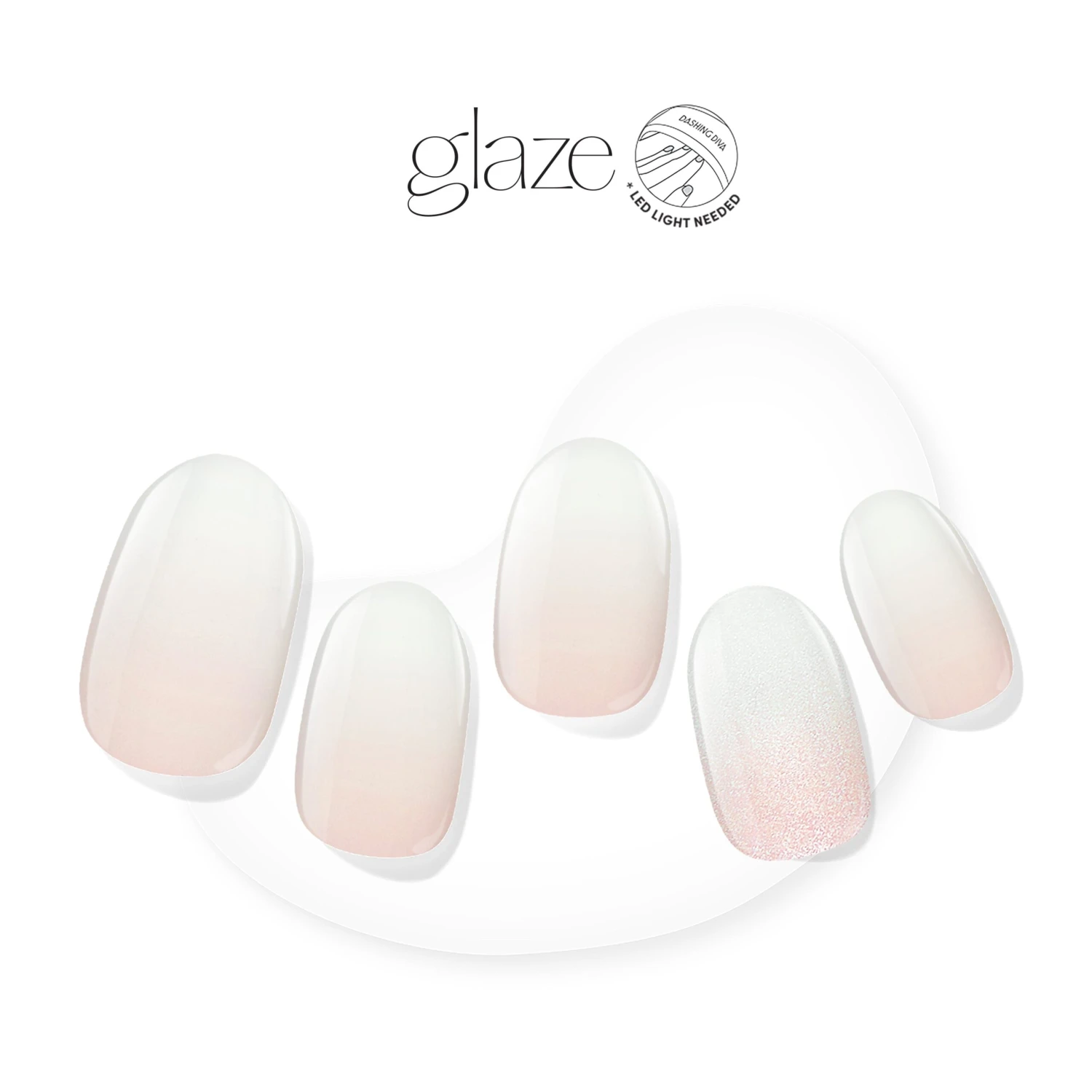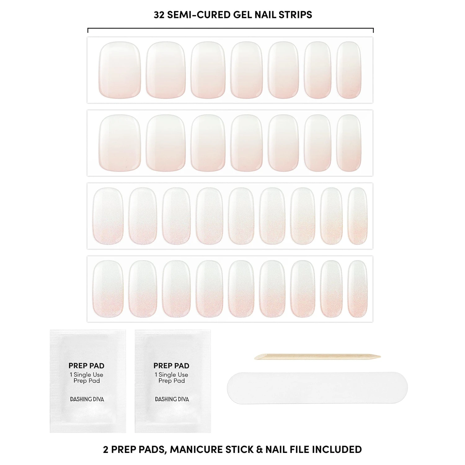 Style is of the essence. Semi-cured off-white gel nail strips featuring a subtle baby pink ombré and a velvet shimmer effect with mega volume and maximum shine.