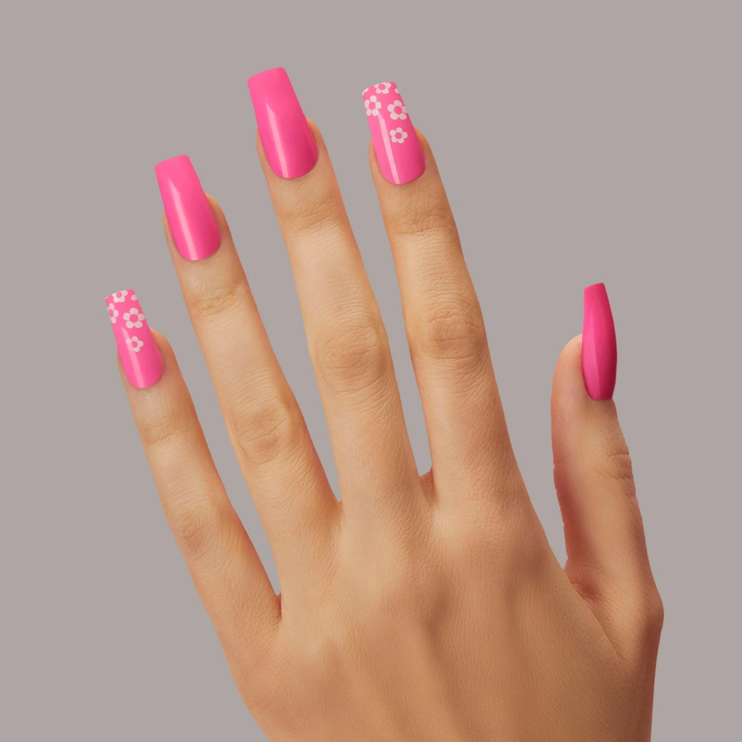 Long length, coffin shape, glossy finish. Neon pink glue-on gel nails featuring pop floral accents.