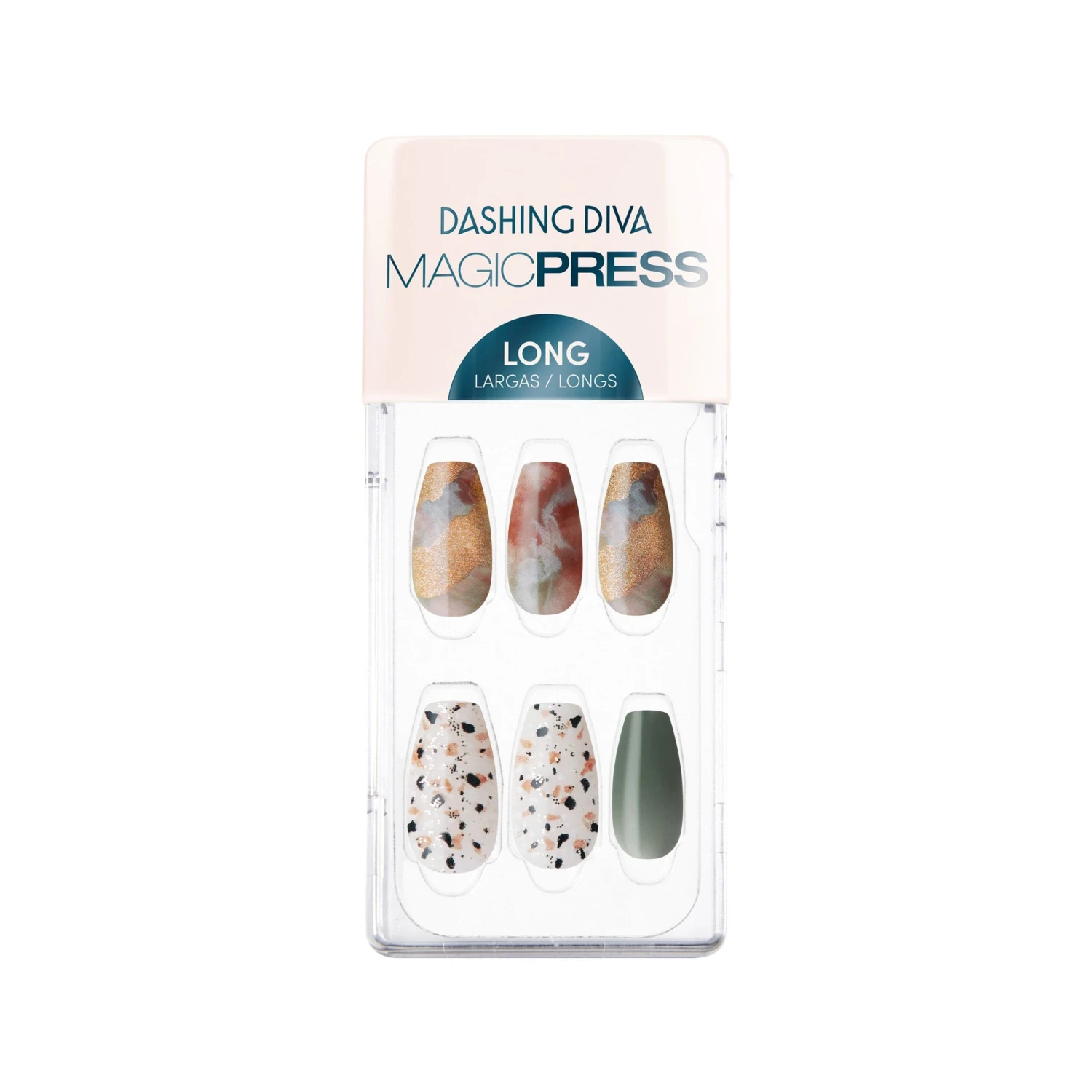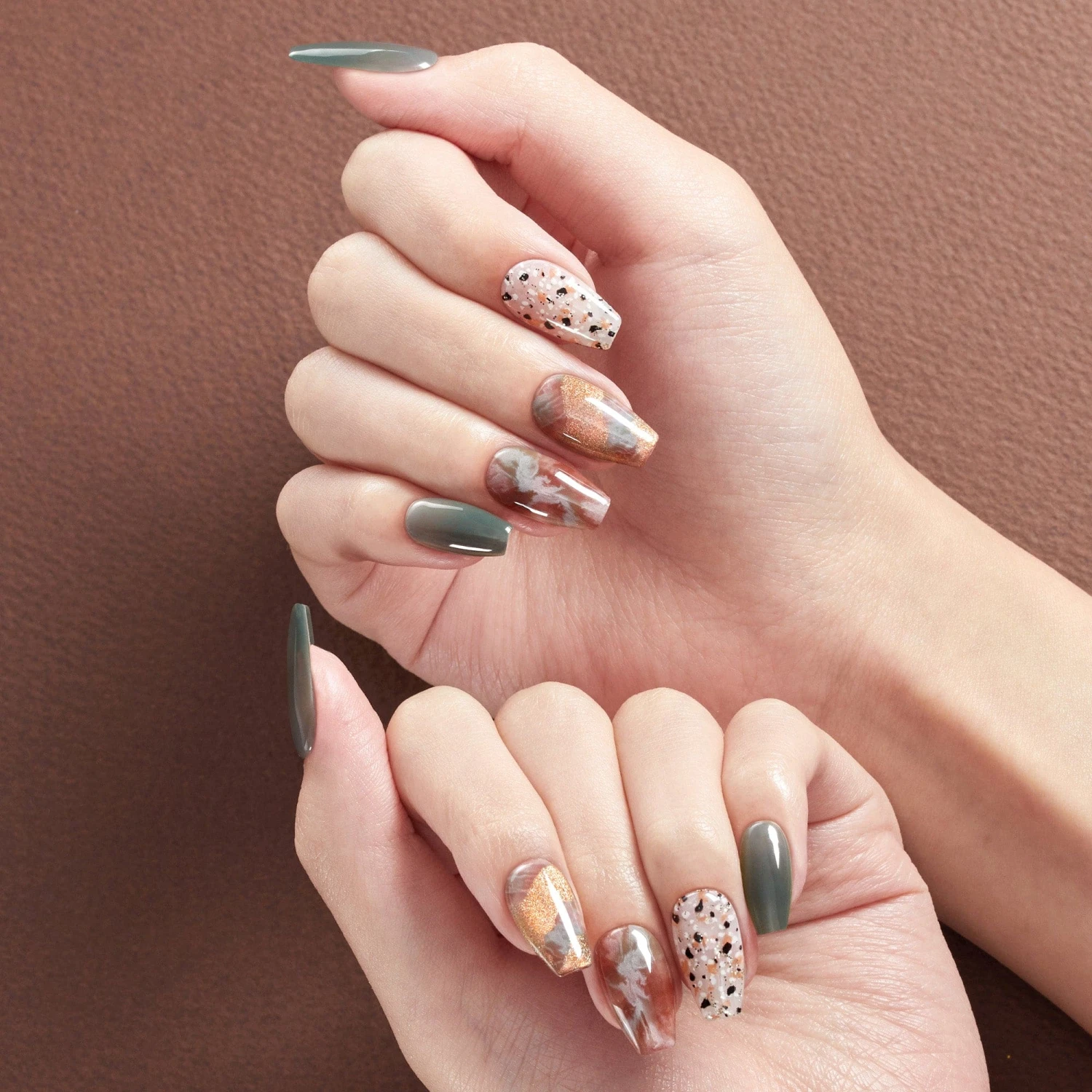 Reduce, re-wear, recycle! Long length, coffin shape, jelly finish press-on gel nails. Featuring earthy greens, mauve, and golden specs.