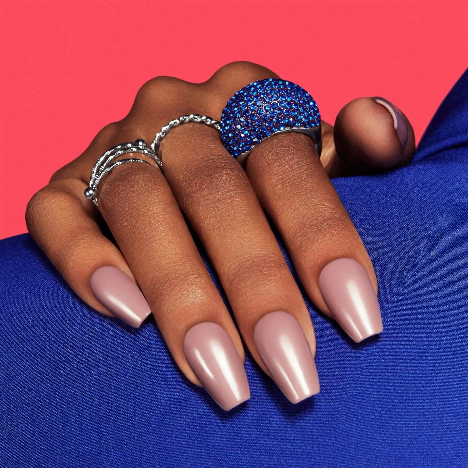 Long length, coffin shape, glossy finish press-on nails. Envelop yourself in soft Nude Velvet for a barely-there neutral that works with a wide variety of skin tones.