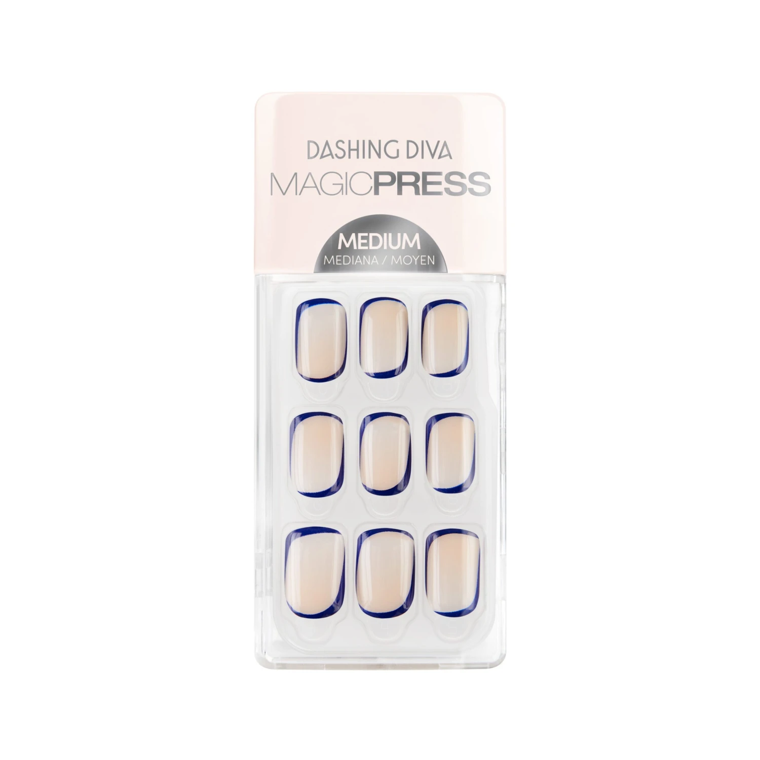 Medium length, square shape, glossy finish press-on gel nails. Be careful you don’t go Off the Edge with these electrifying nails, featuring a cobalt blue edge design.