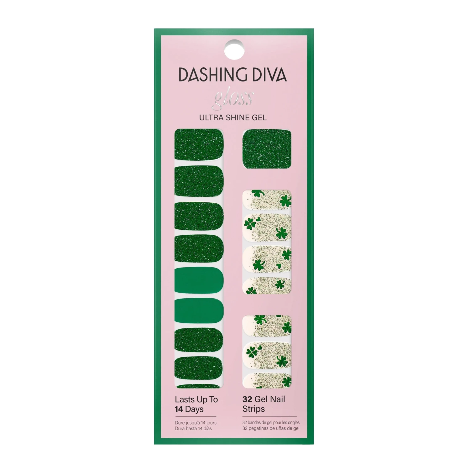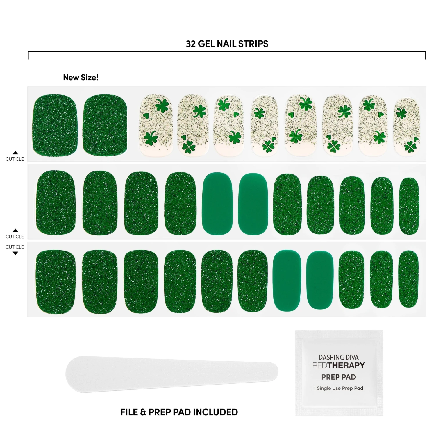 Eat, drink, and be merry. 🍀 Sheer nude & green gel nail strips featuring green & gold glitter and metallic clover accents with a glossy, high-shine finish.